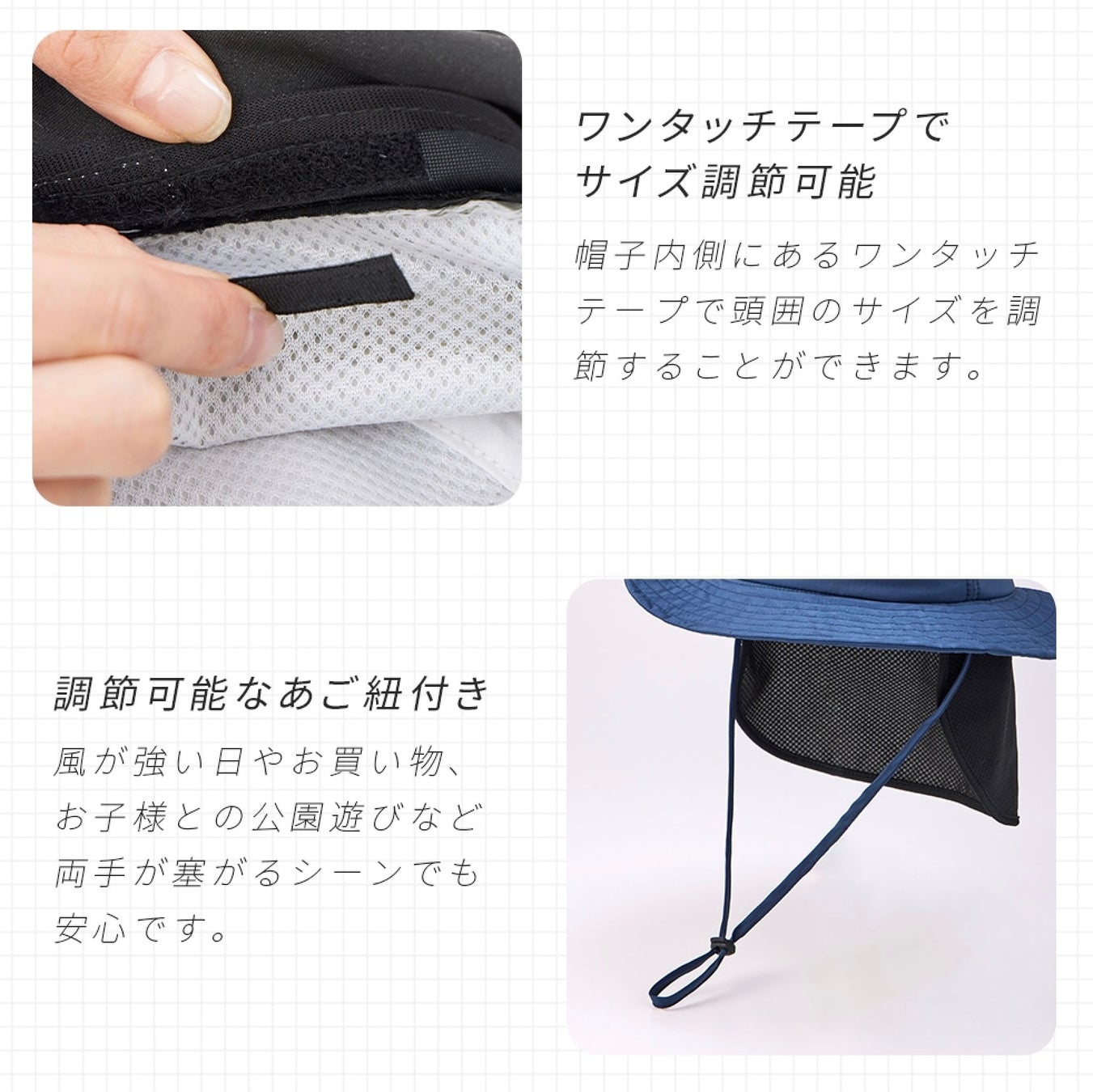 ・水をはじきやすい生地でレジャーでも安心。ワンタッチテープで頭囲のサイズを調節できます。