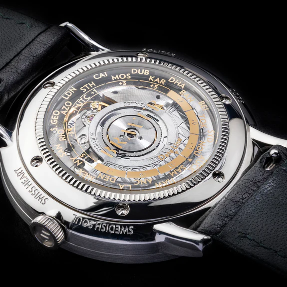 GMT機能を搭載し、異なるタイムゾーンを追跡できるモデル。スイス製SELLITA SW330ムーブメントを採用。