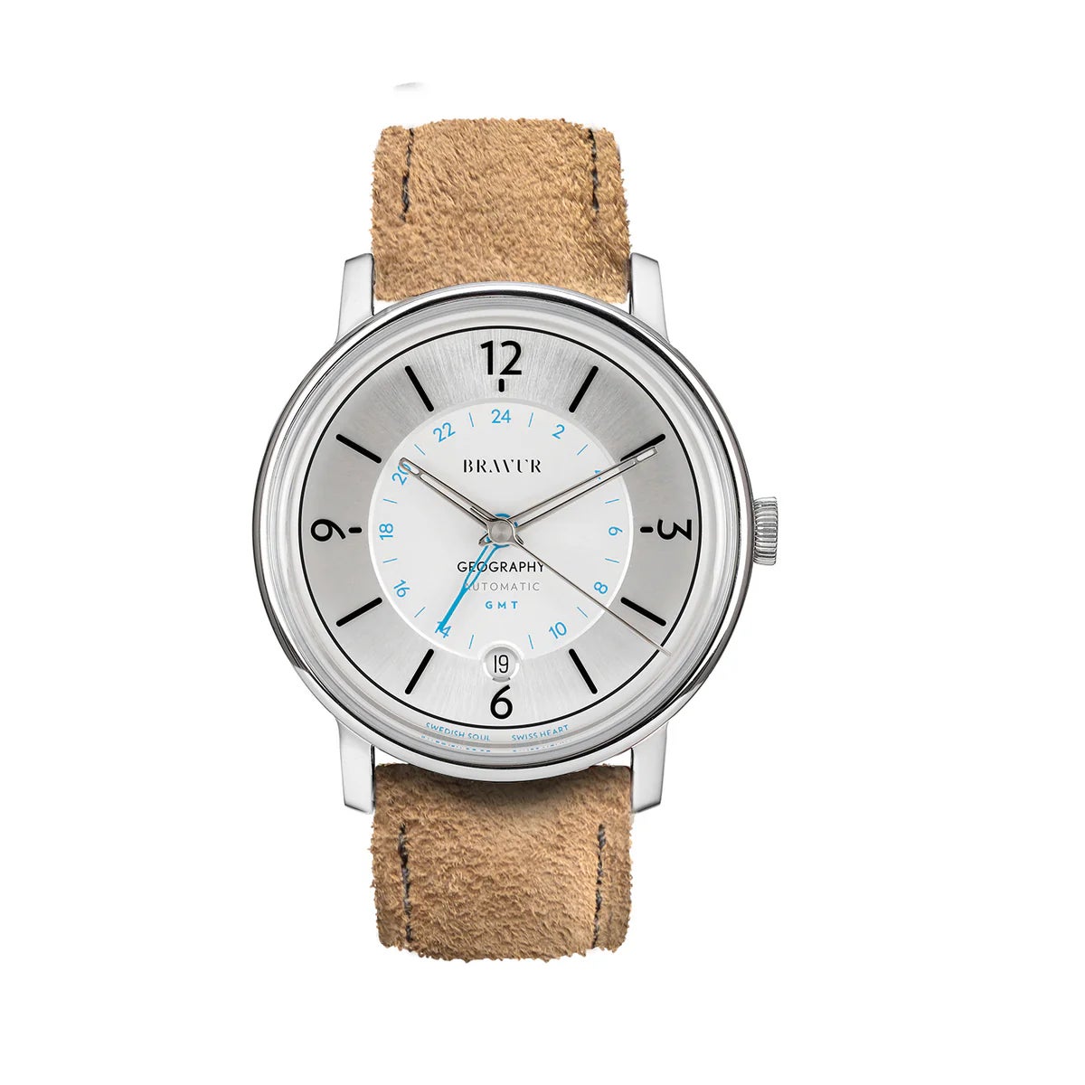 Geographyシリーズは、旅行者を意識して開発され、スタイリッシュに旅行を楽しむための時計です。追加の時針と時差表示機能により、世界中での移動中でも、他のタイムゾーンを簡単に把握することができます。洗練されたシンプルなデザインで、従来のGMT時計とは一線を画しています。凹凸のあるダイヤルには、2トーンカラーが施され、美しさと機能性を兼ね備えています。