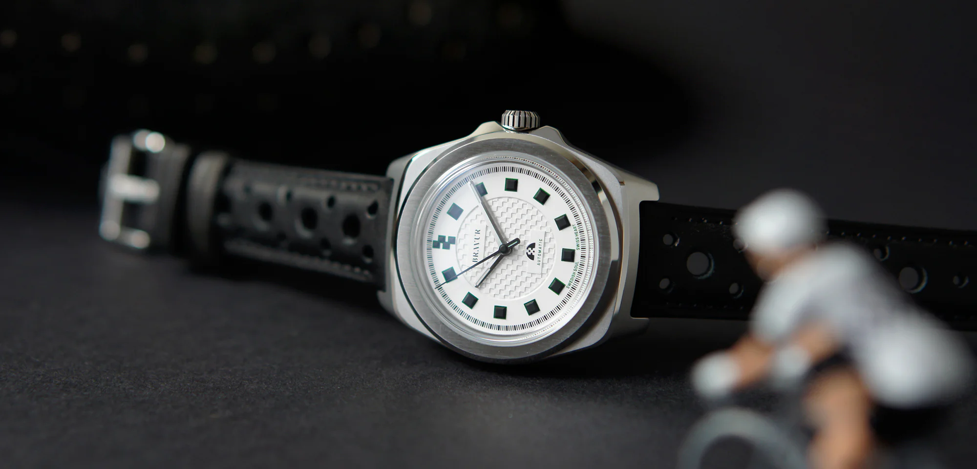 PEUのデザインは、フランスの伝説的なサイクリングチームPeugeotの象徴的なチェッカーパターンにインスパイアされています。歴史に名を刻んだ名ライダーたちが所属し、1963年から1986年まで愛された黒と白のジャージは、サイクリングの象徴となりました。この伝統を受け継ぎ、黒いスクエア型インデックスと12時位置の小さなチェッカーディテールを採用し、個性と視認性を向上。インデックスを囲むグリーンのフレームは、1956年〜1975年にジャージの肩にあったBPロゴへのオマージュです。文字盤中央にはエンボス加工のチェッカーパターンを施し、光と影のコントラストが美しく際立ちます。