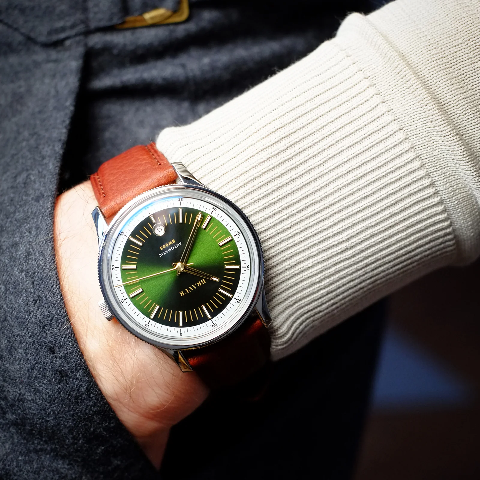 1950年代の北欧デザインの黄金期を彷彿とさせるクラシカルなモデル。サンレイ仕上げの文字盤とスリムなケースが特徴。