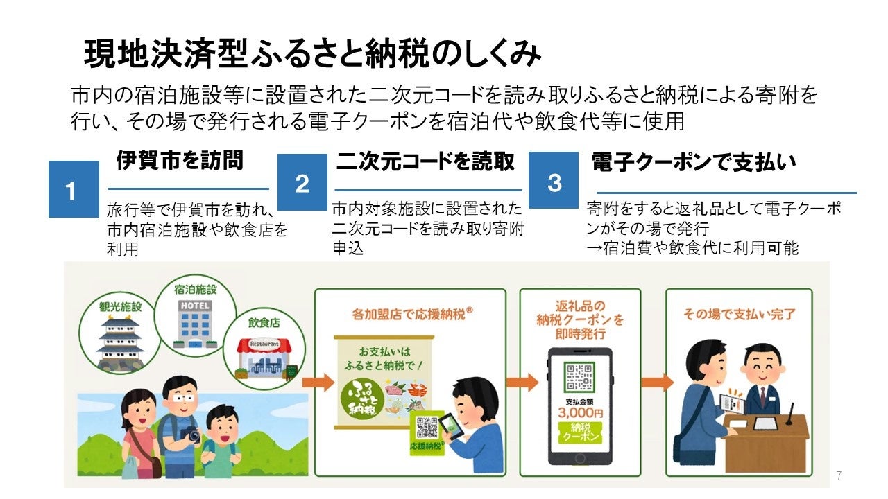 このサービスは、伊賀市を訪れた人がその場で寄附し、すぐに使える電子クーポンを返礼品として受け取ることができるものです。電子クーポンは市内の宿泊施設や飲食店などの加盟店で利用することができます。
