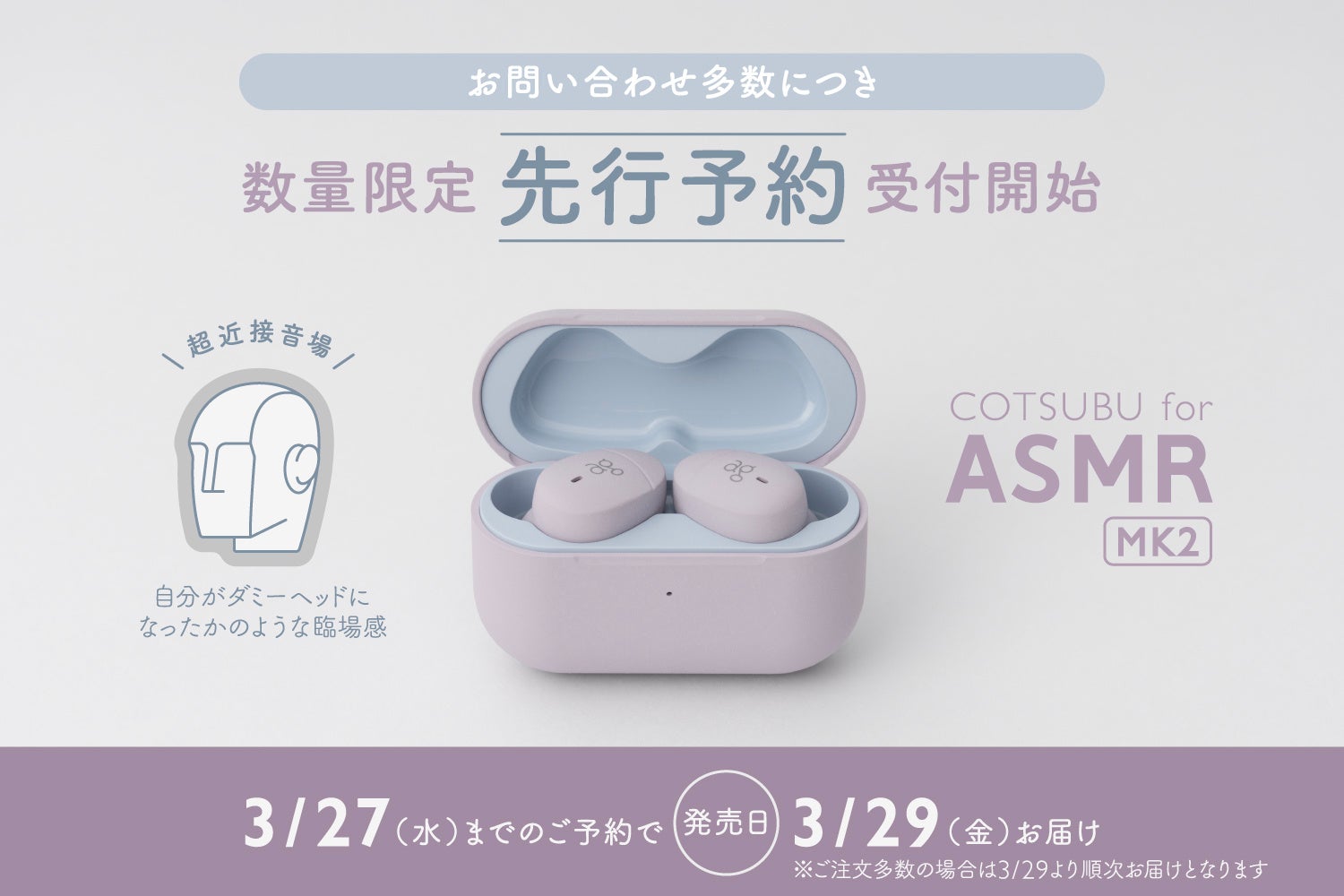 「COTSUBU for ASMR MK2」の楽天市場直営ストア、Amazon直営ストアでの発売は、2024年3月29日(金)からとなりますので予めご了承くださいませ。
