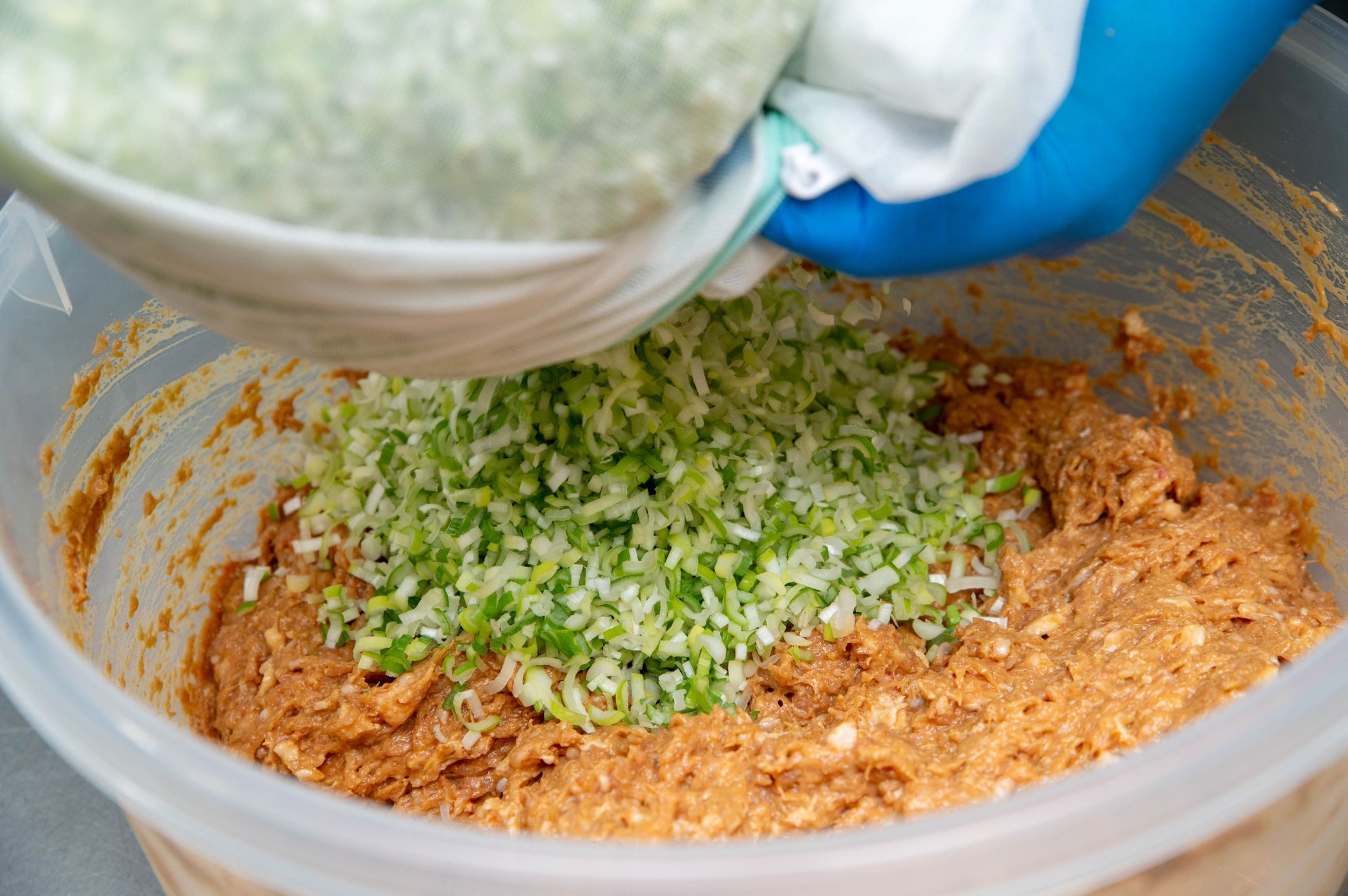1年間の試行錯誤の末、鶏肉と長ネギ に味噌で味付けというシンプルかつ、新しい形の鶏餃子が完成しました。
