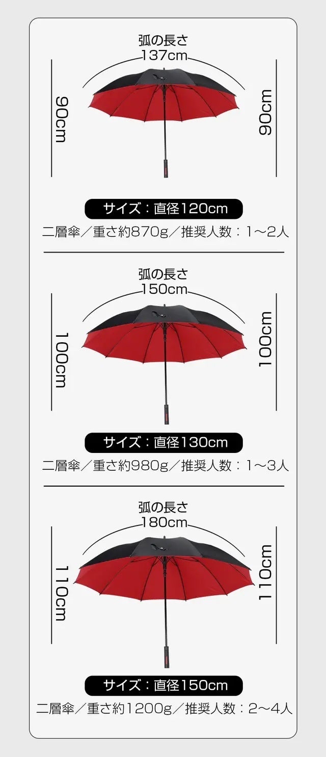 絶対に濡れたくない、いざという時に安心して使える超大型で、150cmくらいの方同士であれば4人くらいでも余裕の広さがあります。毎日の雨対策や、家族でのお出かけ、車内の置き傘に、お客様のご案内用の傘としても最適です。