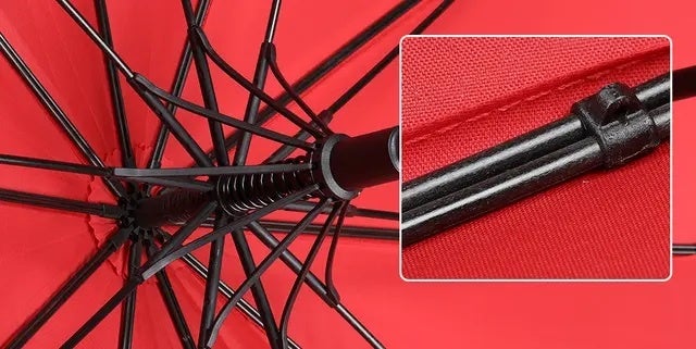 ダブルフレーム構造のこちらの傘は、約2倍の耐風圧があり、安定性が高く吹き飛ばされにくいで特徴があります。素材は、軽量で高強度、靭性が高く、錆びにくて耐久性のあるグラスファイバーを採用しました。強風や大雨の時にも安心感を持ってご使用いただけます。