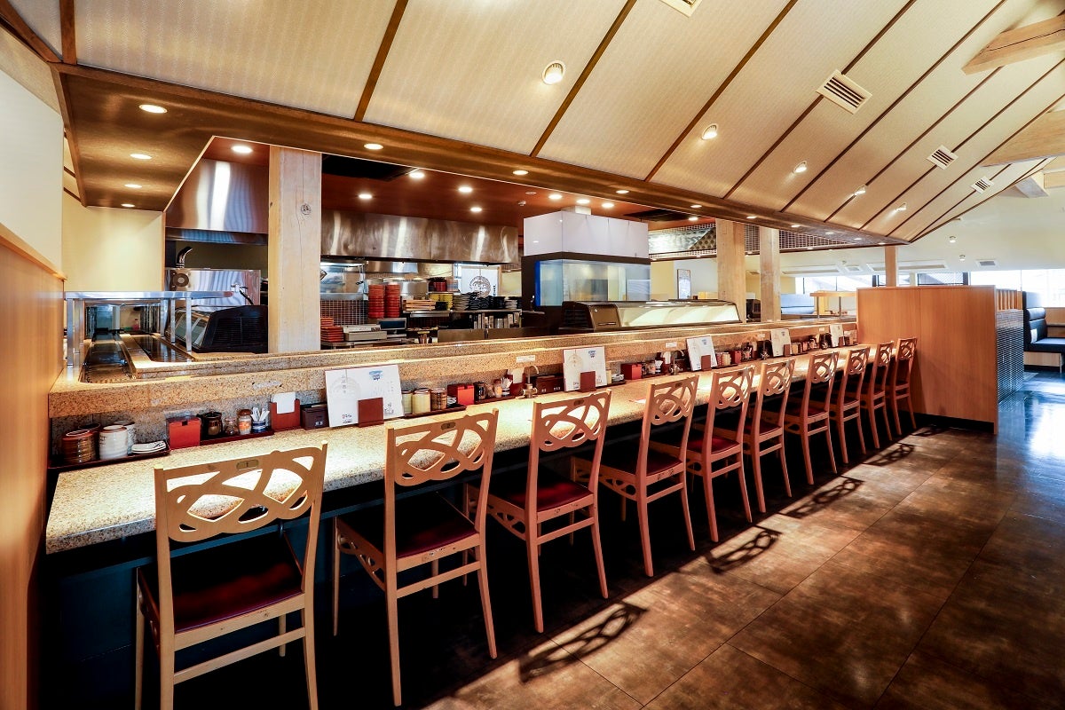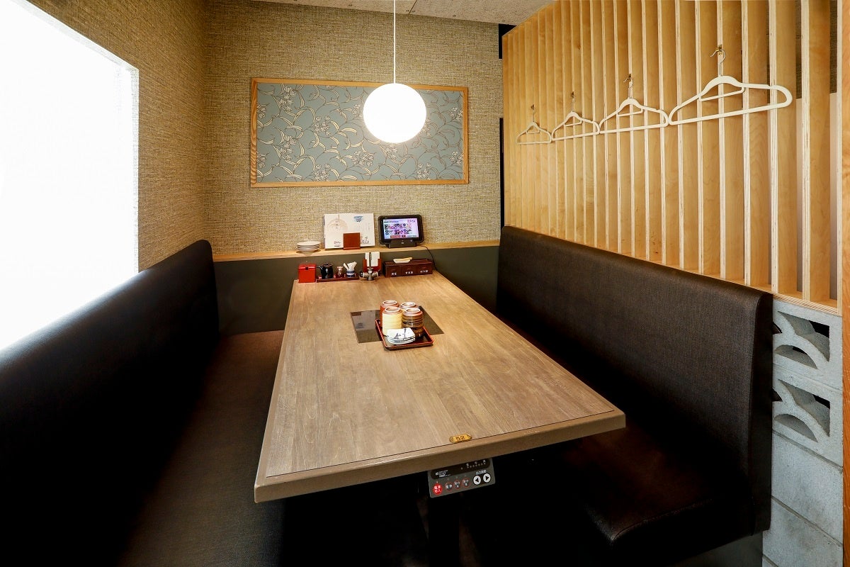 回転レーン横のテーブルはお履き物を脱がずに着座できるベンチシートタイプに変更。(6名掛け×4卓)