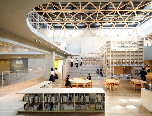 ・廊下のない平面構成により、学校の中心に図書を核とした共用空間「メディアコモンズ」をつくり、様々な形で利用できる場所や出会いの機会を増やし、これまでの学校にはない新たな環境を生み出す。
