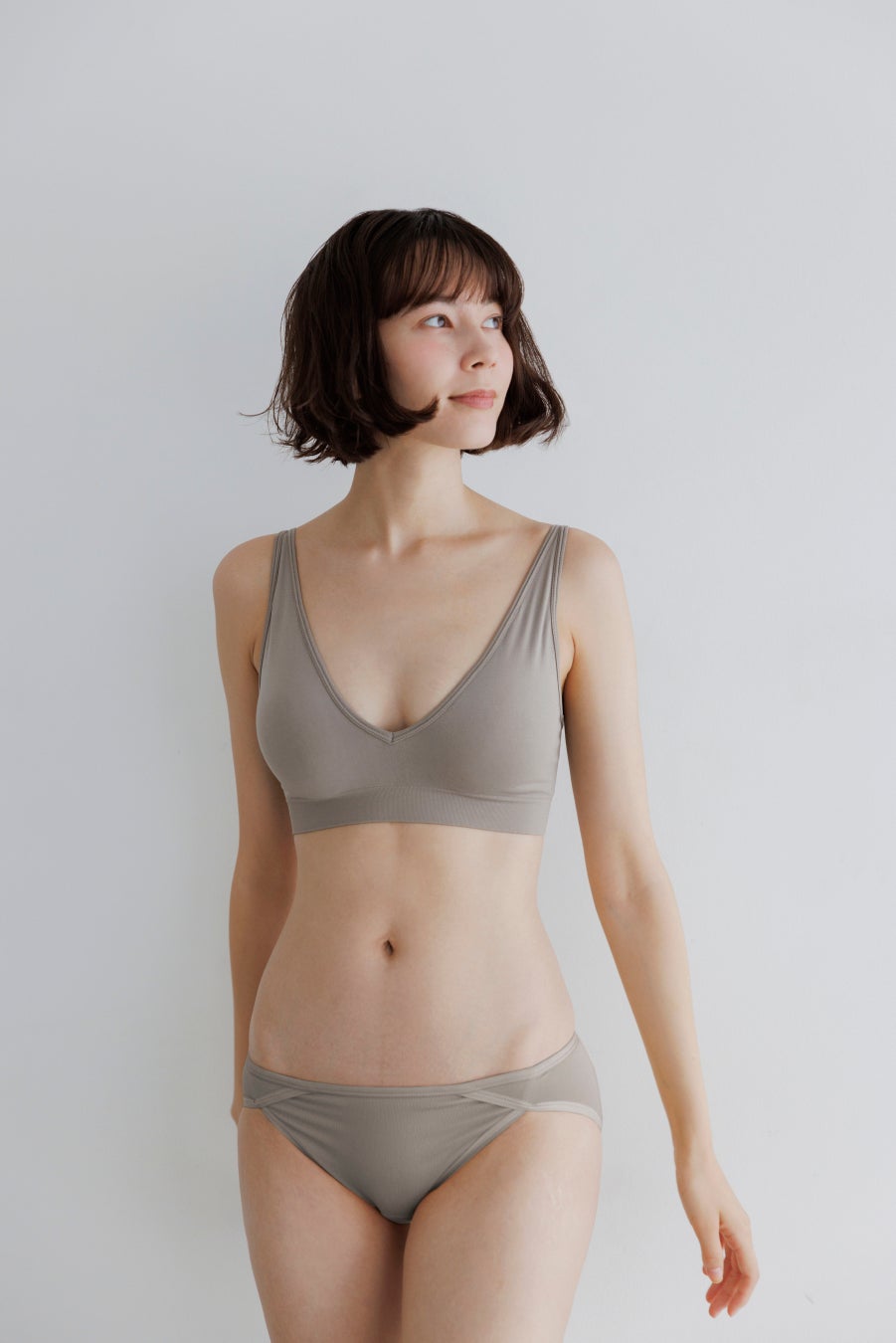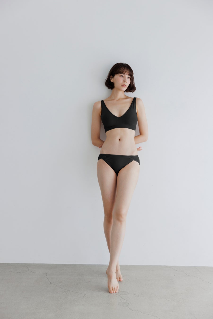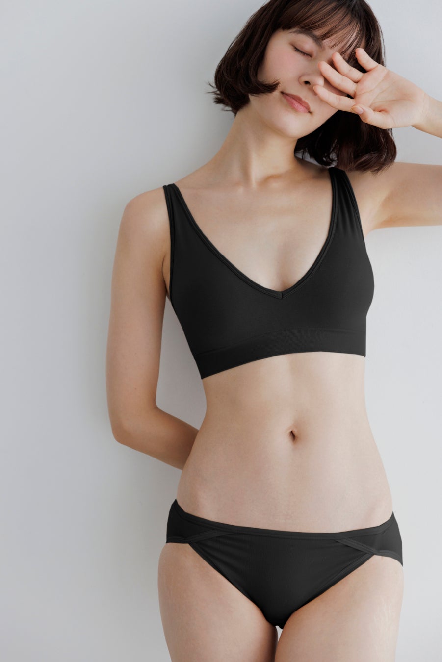 シンプルだけどおしゃれ見えするプランジタイプ。胸元をきれいに見せてくれるVネックで、デコルテの開いたトップスのインナーとしても◎