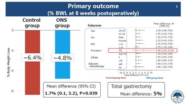 ONS群(62名)vs通常管理群(62名)で、患者背景に有意差は認めなかった。ONS群のONS摂取量は平均309ml(kcal)/日で、85%の患者が1日200kcal以上のONSを摂取できていた。術後8週目の体重減少率はONS群で有意に少なかった(-4.8% vs -6.4%、P=0.039)。握力や血液所見に有意差は認めなかったが、ONS群の総摂取エネルギー量は高い傾向にあり(23 vs 21 kcal/kg、P=0.111)、たんぱく質摂取量は有意に高かった(1.0 vs 0.8g/kg、P=0.006)。ランダム化後の有害事象の発生割合に両群間の差異は認めなかった(7% vs 11%、P=0.373)。QOLの評価項目では、不眠・食欲低下・下痢スコアがONS群で高かった。