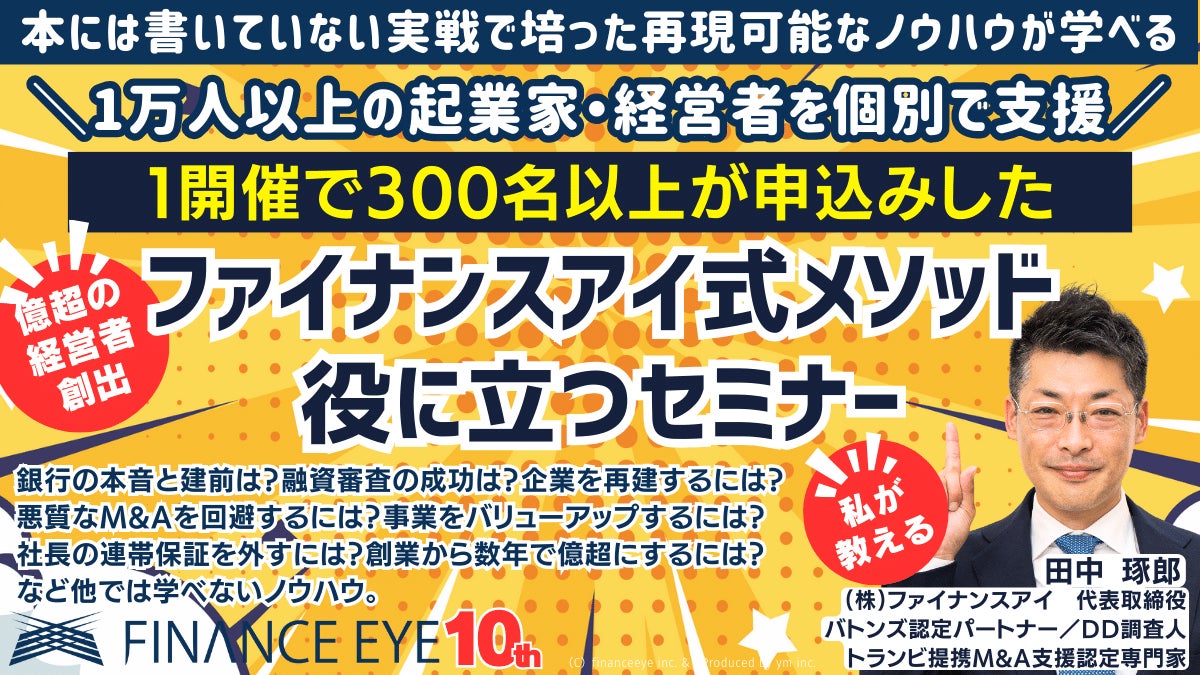 大手金融機関・上場企業の財務・企業再生・M&Aの実務を歴任した経験をもとに、2014年に株式会社ファイナンスアイを創業。創業10年で延べ10,000人以上の中小企業・起業家・個人事業主たちの資金調達・ファイナンス・経営改善・M&A等に対応。事業承継・M&Aの支援も本格化し、経営支援や企業再生で培った金融機関交渉や赤字再建の経営改善(PMI)の手腕を活かして売手・買手のいずれの立場からも支援。毎週セミナー開催。
