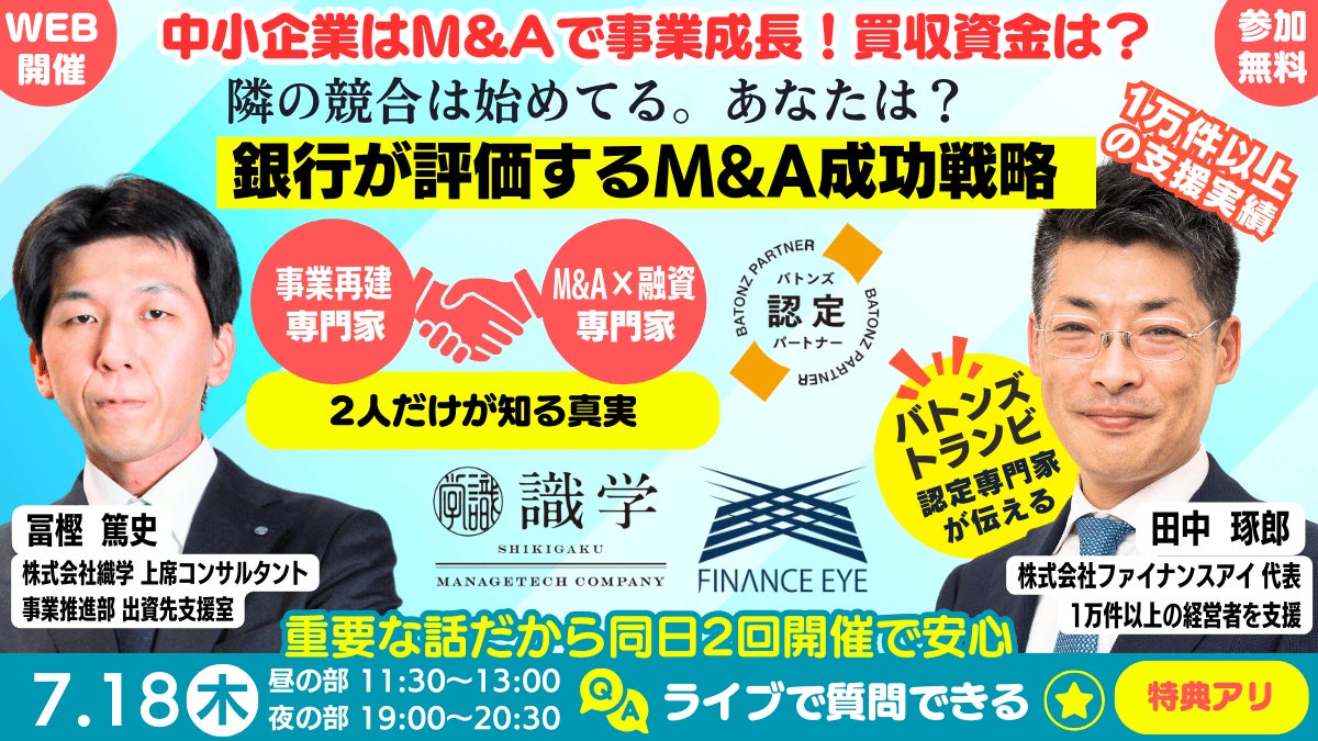 国内最大の2大M&AサイトであるBATONZ(バトンズ)とTRANBI(トランビ)の認定専門家としてM&A×融資を支援し続ける株式会社ファイナンスアイ(所在地:大阪市、代表:田中琢郎)は、「識学」を使った経営・組織コンサルティングや従業員向け研修を展開する株式会社識学(本社:東京都品川区、代表取締役社長:安藤広大)と『中小企業はM&Aで事業成長!買収資金は?銀行が評価するM&A成功戦略』と題し、共同でオンラインセミナーを2024年7月18日(木)昼の部11:30開始・夜の部19:00開始に開催することをお知らせします。このセミナーでは、日本国内M&A成約数1位のBATONZ(バトンズ)認定パートナー/認定アドバイザー/認定DD調査人、国内最大級のM&AサイトTRANBI(トランビ)提携のM&A支援の認定専門家である田中琢郎社長自らが、1万人以上の起業家や経営者を支援した実戦経験をもとに、中小企業がM&Aを成功させる戦略を分かりやすくお伝えします。さらに、織学からは織学ファンドが出資した企業に入り事業再建させた冨樫氏が登壇。セミナーでは講師とライブで質疑応答ができるので具体的なアドバイスが欲しい人はチャンスです。セミナー申込時の受付フォームで事前質問に記入してもらえれば、セミナー中に回答できそうにない内容でも別途具体的なアドバイスを受けられます。この機会に誰にも相談できなかった悩みや疑問を解決しましょう。