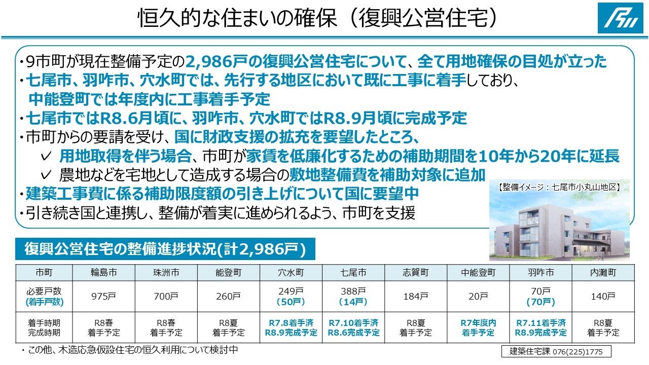 石川県では、引き続き、国と連携しながら、復興公営住宅の整備が着実に進められるよう市や町を全力で支援していきます。