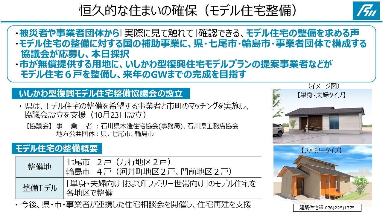住まいの再建相談会において、被災者や事業者団体から「実際に見て触れて」確認できるモデル住宅の整備を求める声があり、こうした声を踏まえて、モデル住宅の整備に対する国の補助事業に、県・七尾市・輪島市・事業者団体で構成する協議会が応募し、11月20日に採択されました。