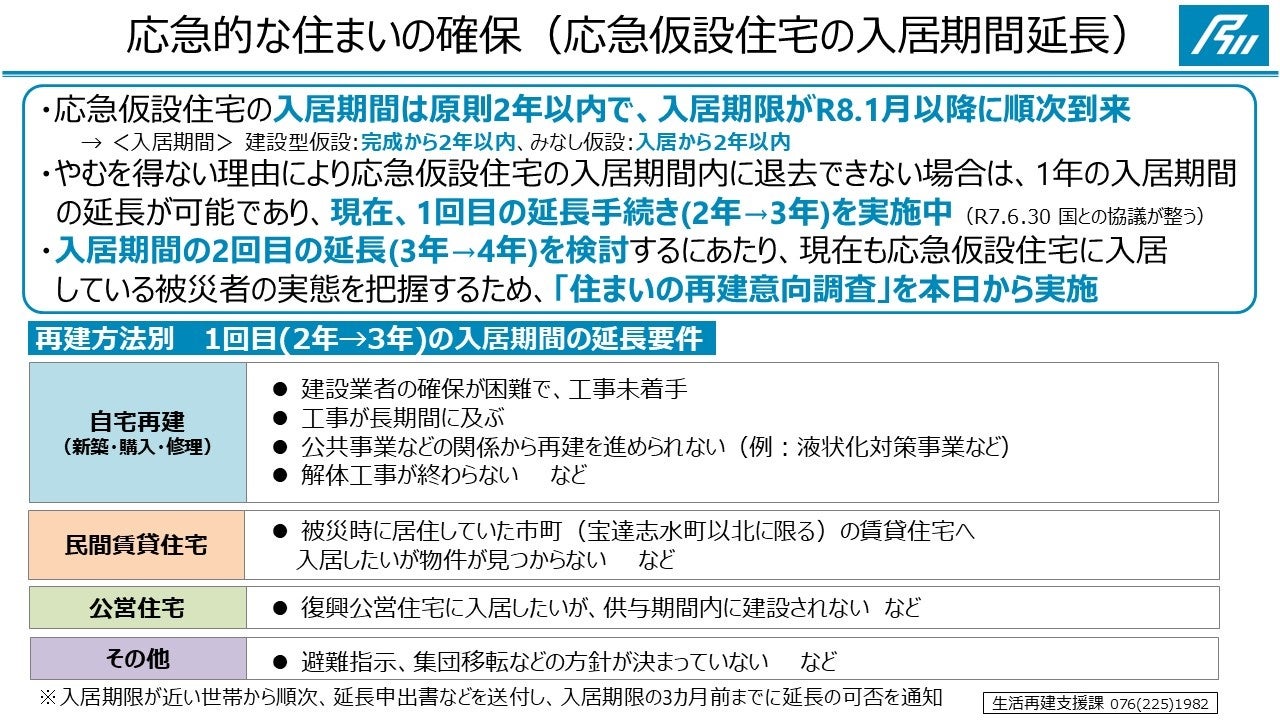 また、2回目の延長となる3年から4年への延長を検討するため、現在も応急仮設住宅に入居している被災者を対象に、「住まいの再建意向調査」を、11月20日から実施しています。