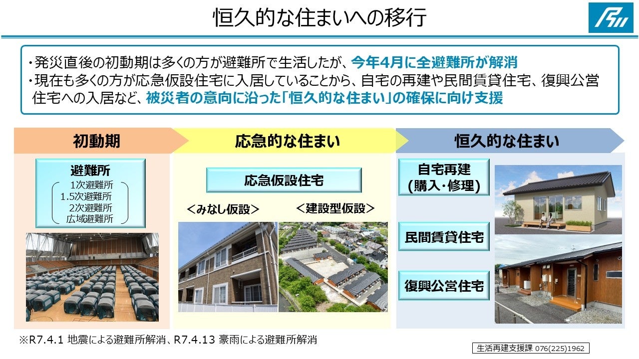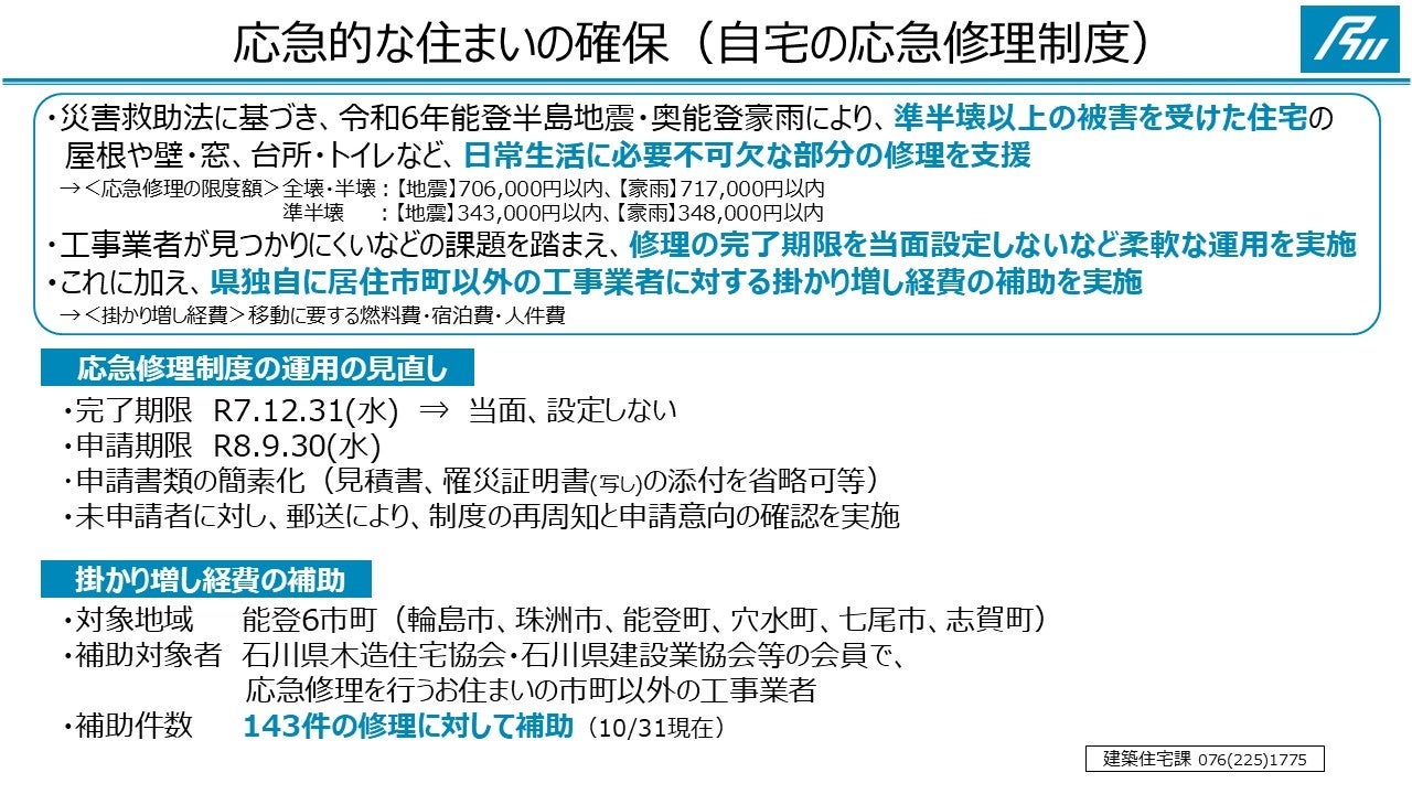 また、能登地域では工事業者が見つかりにくいなどの課題を踏まえ、修理の完了期限を当面設定しない、申請書類を簡素化するなどの運用の見直しを行いました。