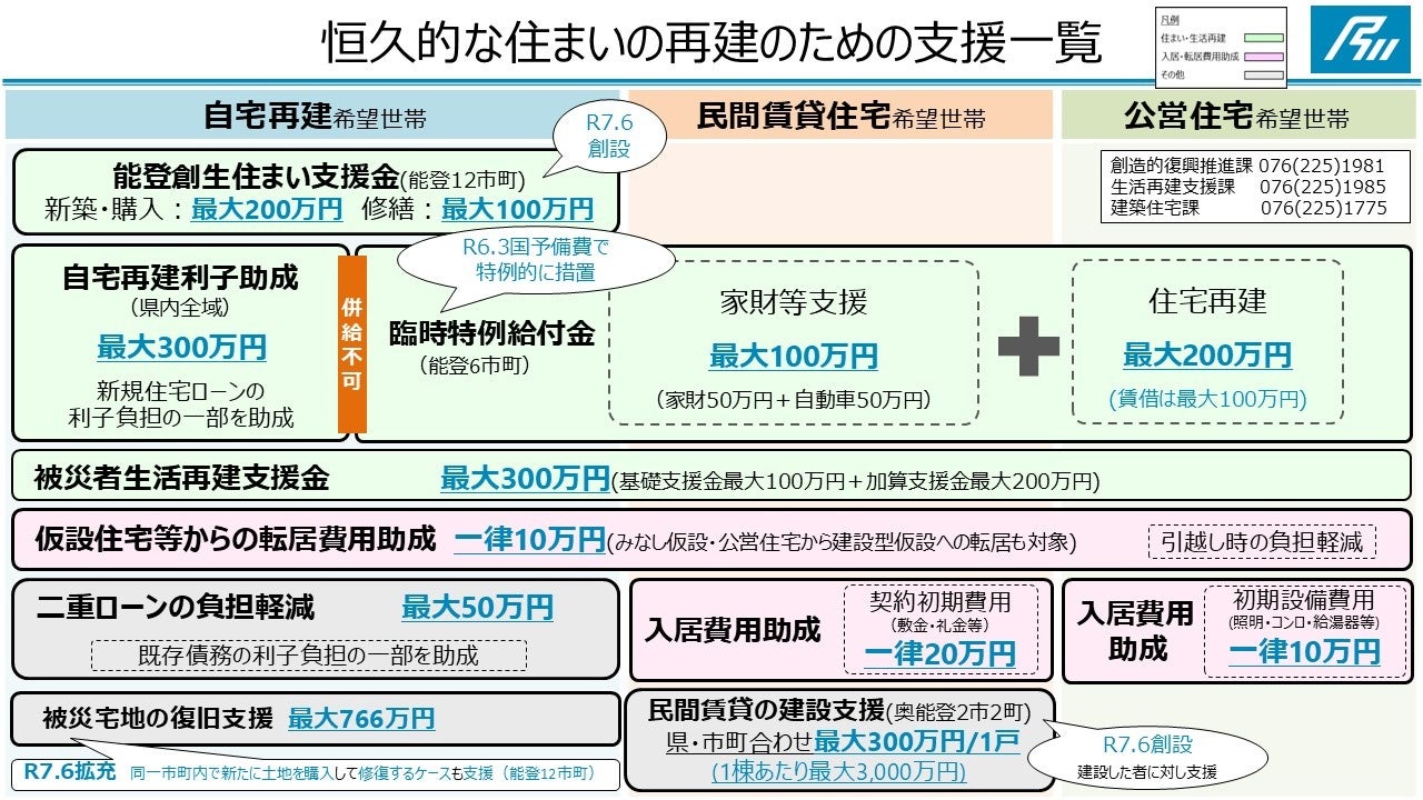 自宅再建については、被災地での自宅再建を後押しするため、今年6月に「能登創生住まい支援金」を創設し、新築・購入は最大200万円、修繕は最大100万円の支援を県と市町が一体となって行い、10月から能登12市町全てにおいて申請受付が開始されています。