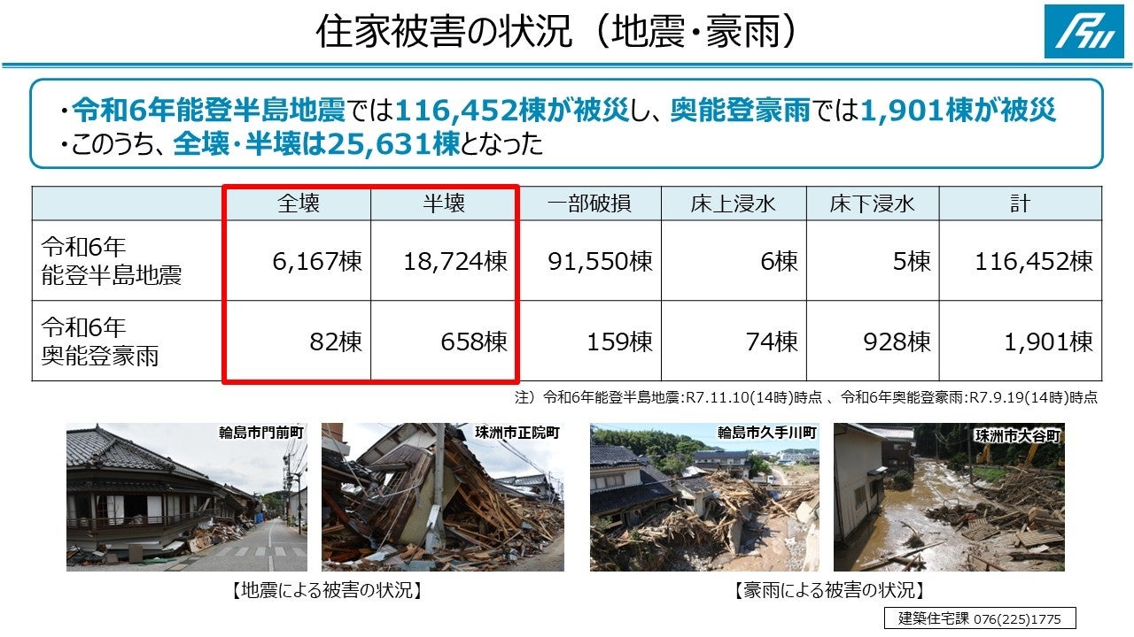 令和6年能登半島地震では116,452棟、奥能登豪雨では1,901棟の住家が被災し、このうち全壊・半壊は、25,631棟となっています。