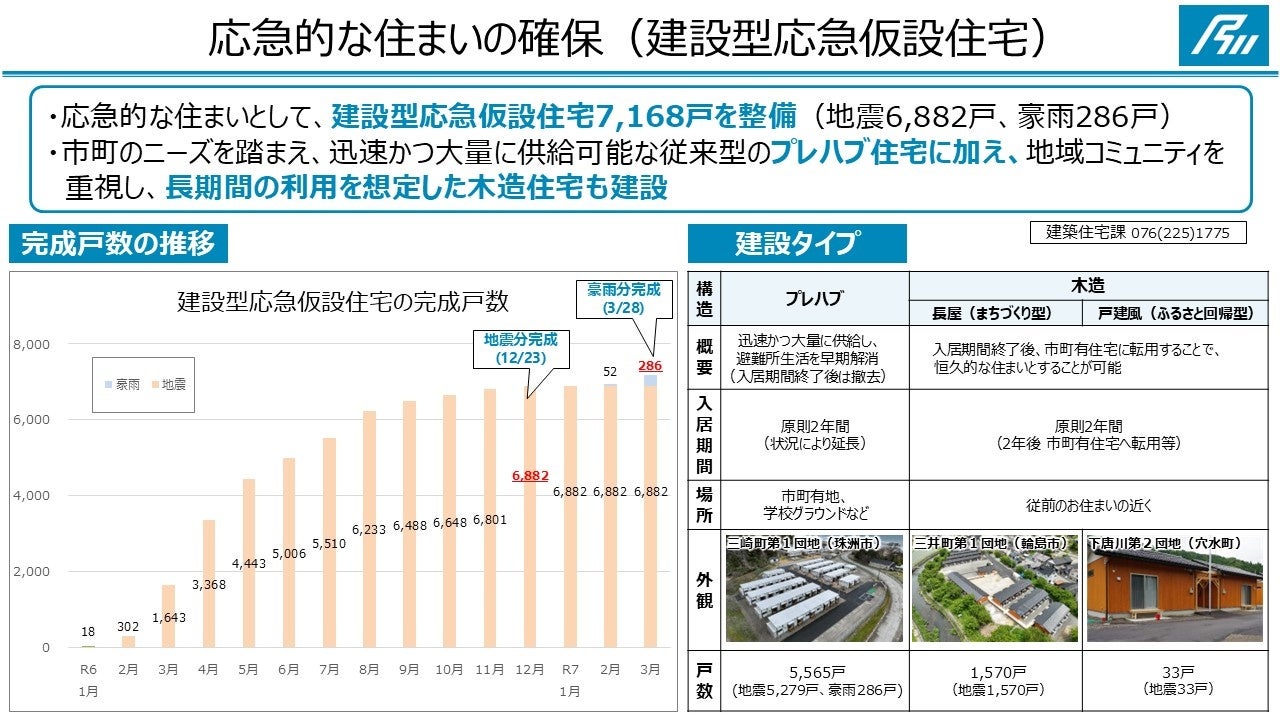 地震・豪雨の被災者の応急的な住まいとして、石川県では、今年3月までに建設型応急仮設住宅7,168戸を整備しました。
