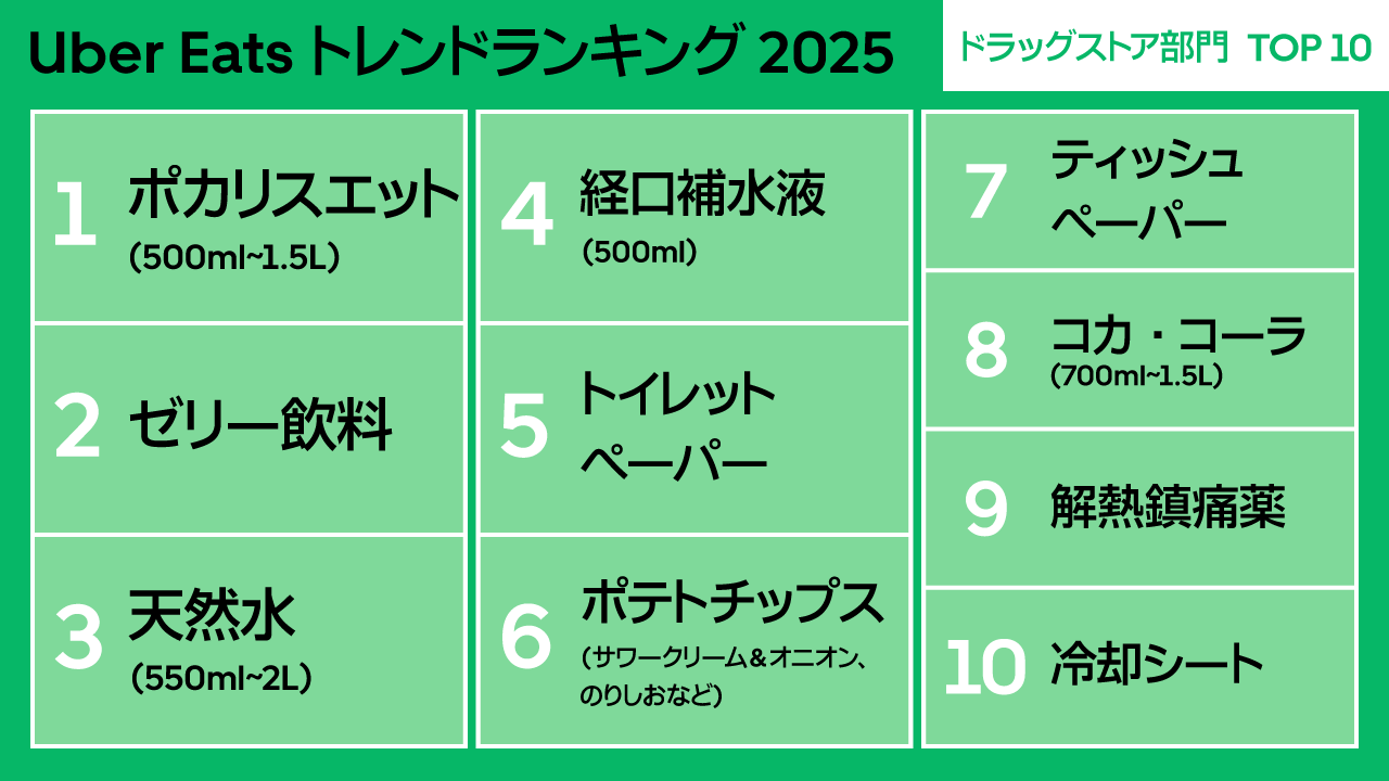 ▪️ドラッグストア部門ランキング: ゼリー飲料から解熱鎮痛薬まで、Uber Eatsは”体調不良時の味方”