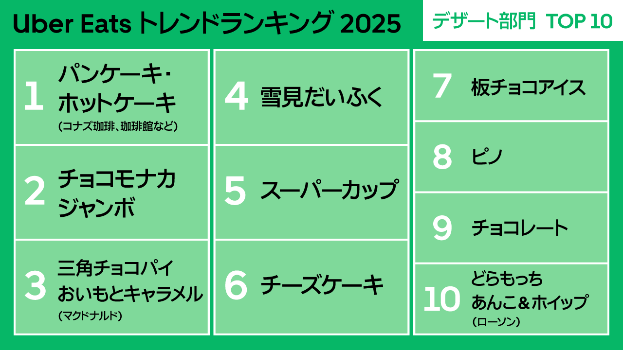 さらに、「三角チョコパイ おいもとキャラメル(マクドナルド)」のような期間限定スイーツやSNSで話題を集めた商品が上位にランクイン。 「新作スイーツを試したい」というトレンド消費層にUber Eatsが活用されていることが明らかになりました。