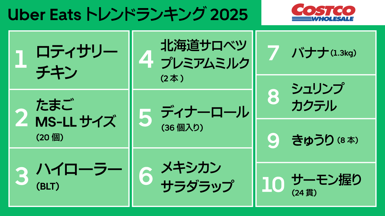 本ランキングは、年間を通しての傾向をまとめたもので、年間ランキングとしての公開は今回が初となります。 今年6月に発表した「上半期トレンドランキング」に続き、 今回は料理、デザート、食品・日用品、ドラッグストア、中小規模飲食店の5部門におけるデータを分析しました。 さらに、Uber Eatsで注文可能なコストコ商品の人気動向や、 年間を通して最も注文された商品など、2025年の食トレンドを象徴する結果も紹介しています。