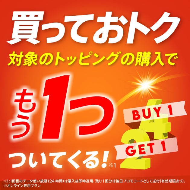 現在ご利用中の1年間トッピングの有効期限翌日までに、対象の1年間トッピングを継続購入いただくと、追加でデータをもらえます。