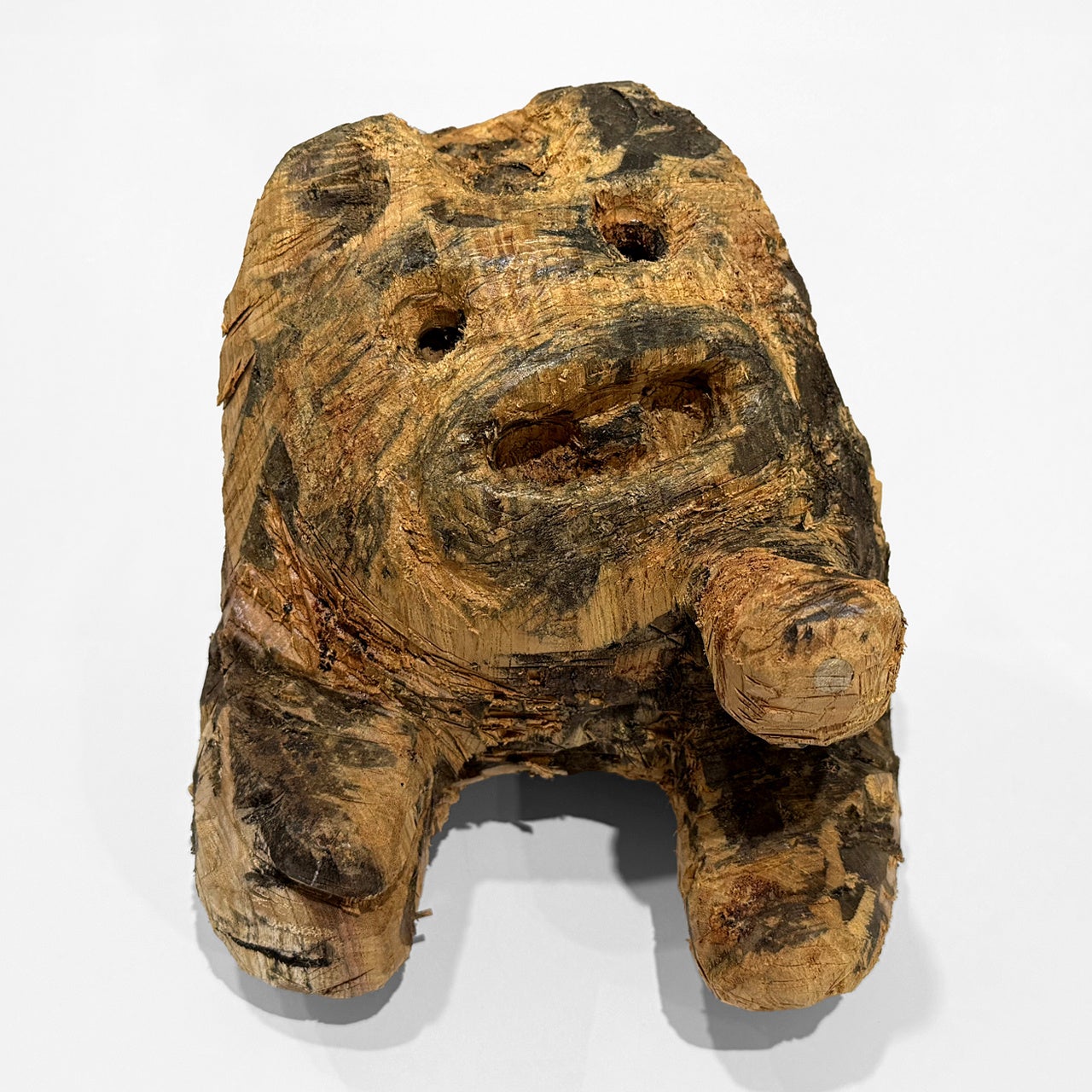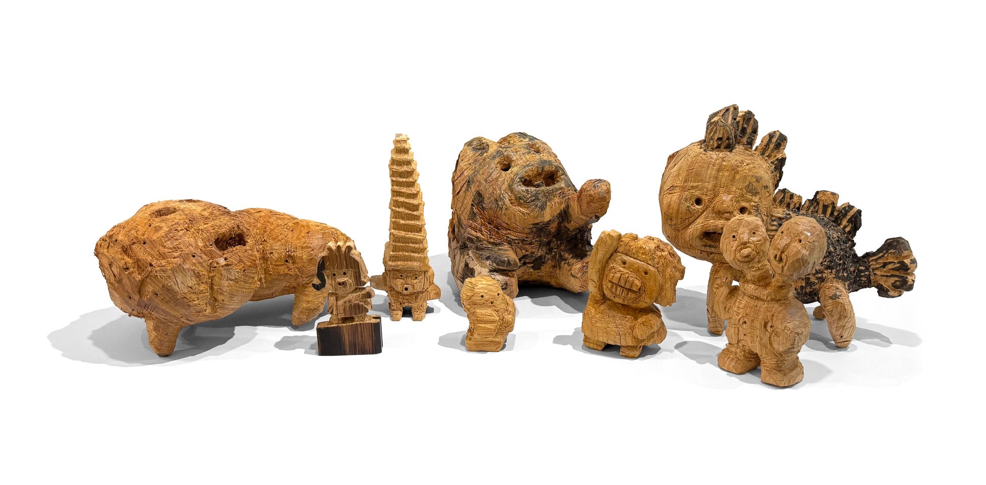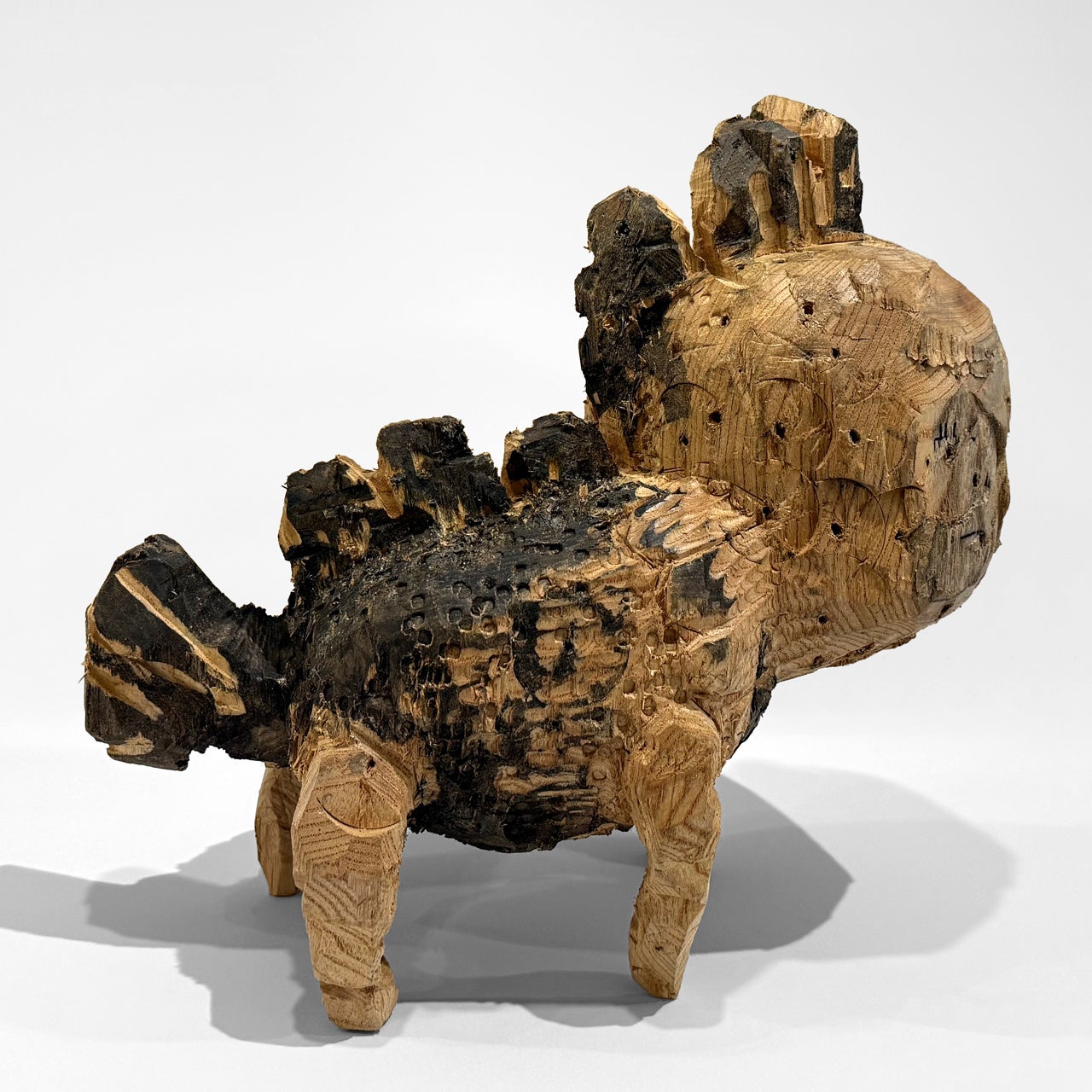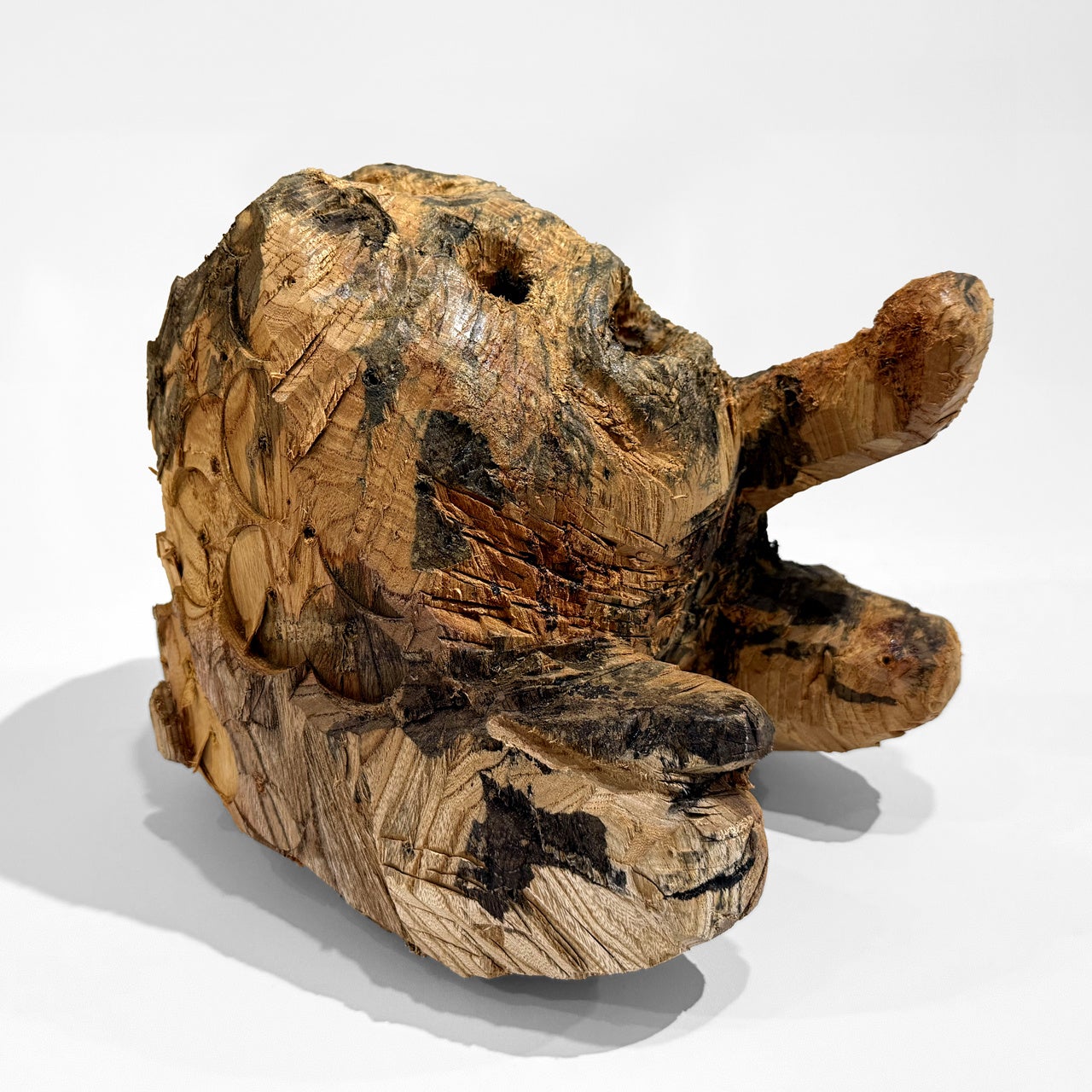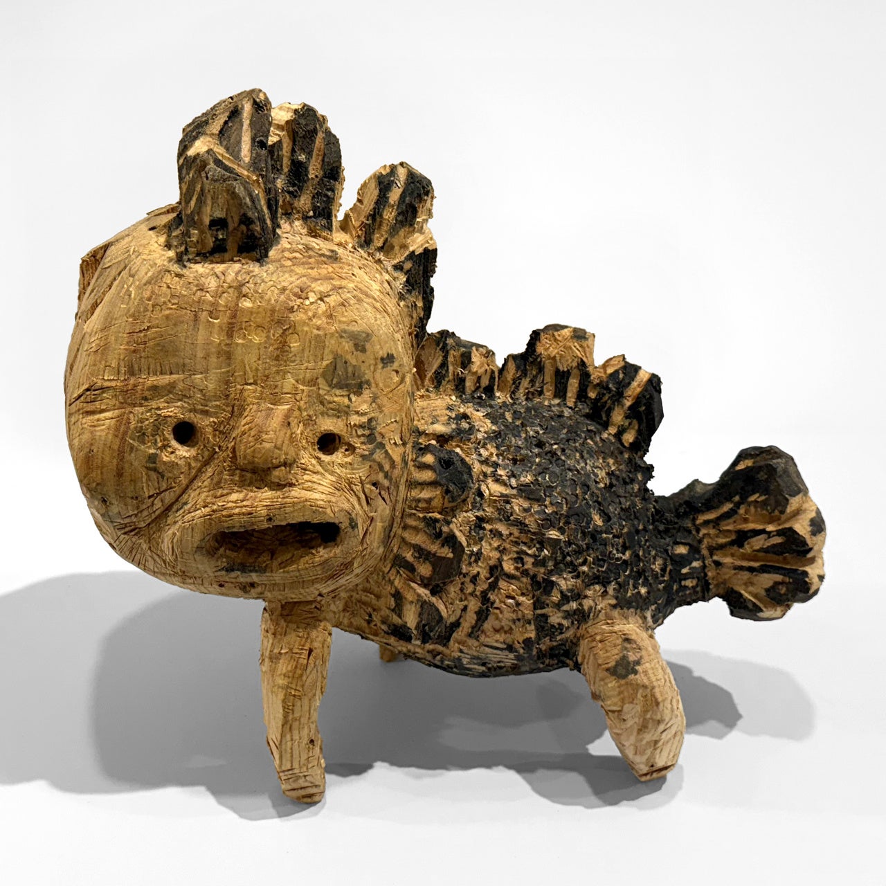 素材であるずっしりとした木材や小さな木片、廃材なども使い、あえて表面を木工ドリルで穴だらけにしたり、生々しい削り跡を残したままにしながら、強烈な存在感を放つモンスターや悪魔、愛らしい反面ちょっと怖さが潜む女の子やユーモラスな動物、不可解な生き物などの木彫作品を次々と生みだしている。