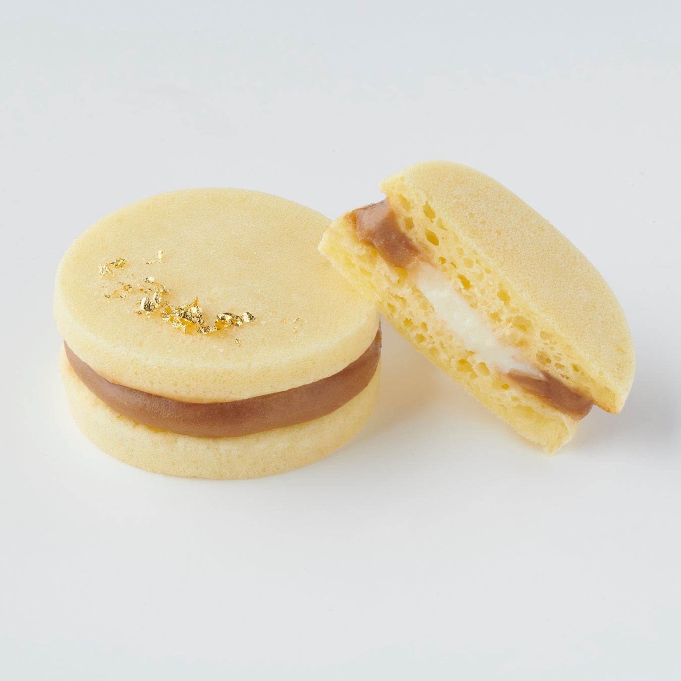 黄金色に揺れる稲穂を金粉で表し、和・洋菓子の代表 あんことクリームを優しく生地に挟んで仕上げました。