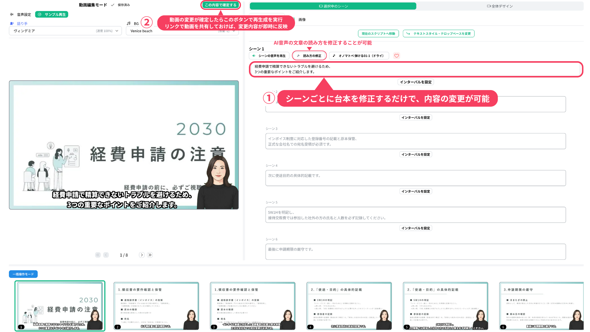 また、研修内容に変更が生じた場合でも、NoLangの編集画面からテキストを修正するだけで、簡単に動画を更新できます。特に動画をリンクで共有している場合は、「この内容で確定する」ボタンを押して再生成するだけで、リンク先の動画にも即時に変更が反映されます。これにより、動画ファイルを再ダウンロードしてメールで再送付したり、社内ポータルのファイルを差し替えたりといった工数のかかる作業なしに、常に最新の動画を全社員へ共有することが可能です。