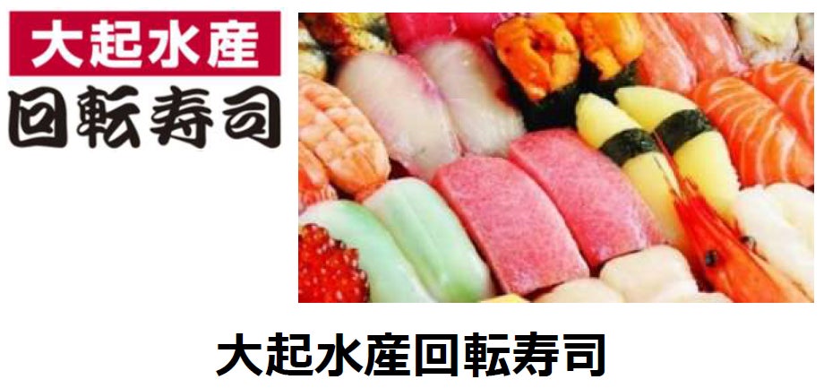 ⼤阪を中⼼に店舗を展開する「⼤起⽔産回転寿司」が出店し、こだわりの本まぐろをはじめ様々なネタをご堪能いただけます。