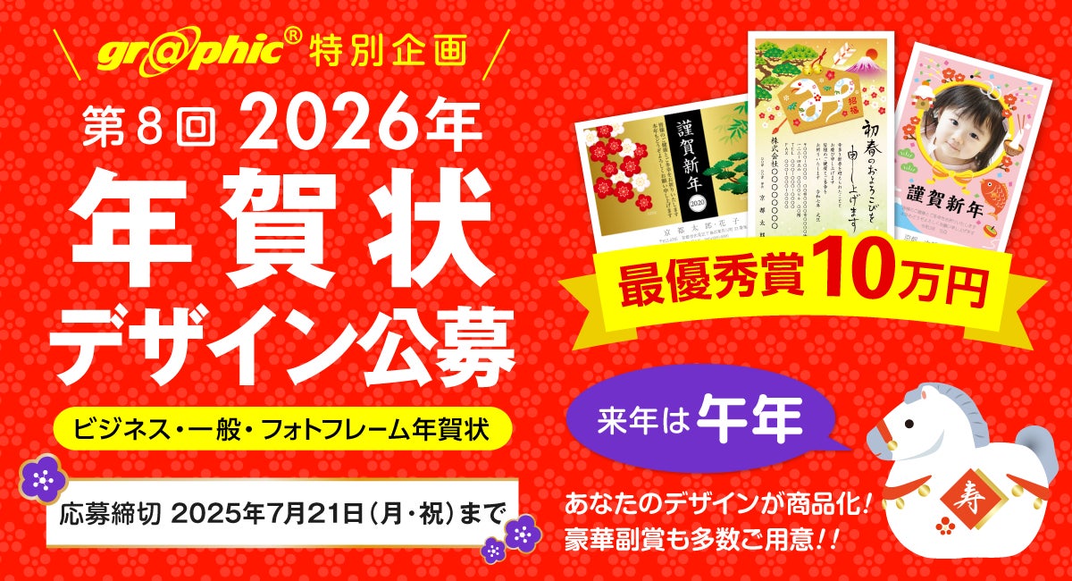 株式会社グラフィック(本社:京都市伏見区、代表取締役社長:西野能央、以下「当社」)はネット印刷事業にて、「第8回 2026年 年賀状デザイン公募」を開催。午年(うま年)のオリジナル年賀状デザインを募集します。最優秀賞には賞金10万円、特別賞にはApple Watchなど、総額100万円以上の豪華副賞をご用意しております。