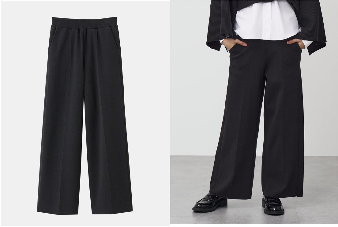 「コットンブレンドイージーパンツ」は、ウエストを総ゴムで仕上げ、窮屈感のない程よいフィット感が特長のイージーパンツです。膝まで施された裏地により、ニット素材にありがちな「膝が出やすい」といった悩みを軽減します。また、編地の切り替えでセンターラインを入れることで、脚のラインを美しく見せる効果もあります。さらに、両サイドに付けたポケットや、自宅での手洗いが可能など、実用性も兼ね備えています。
