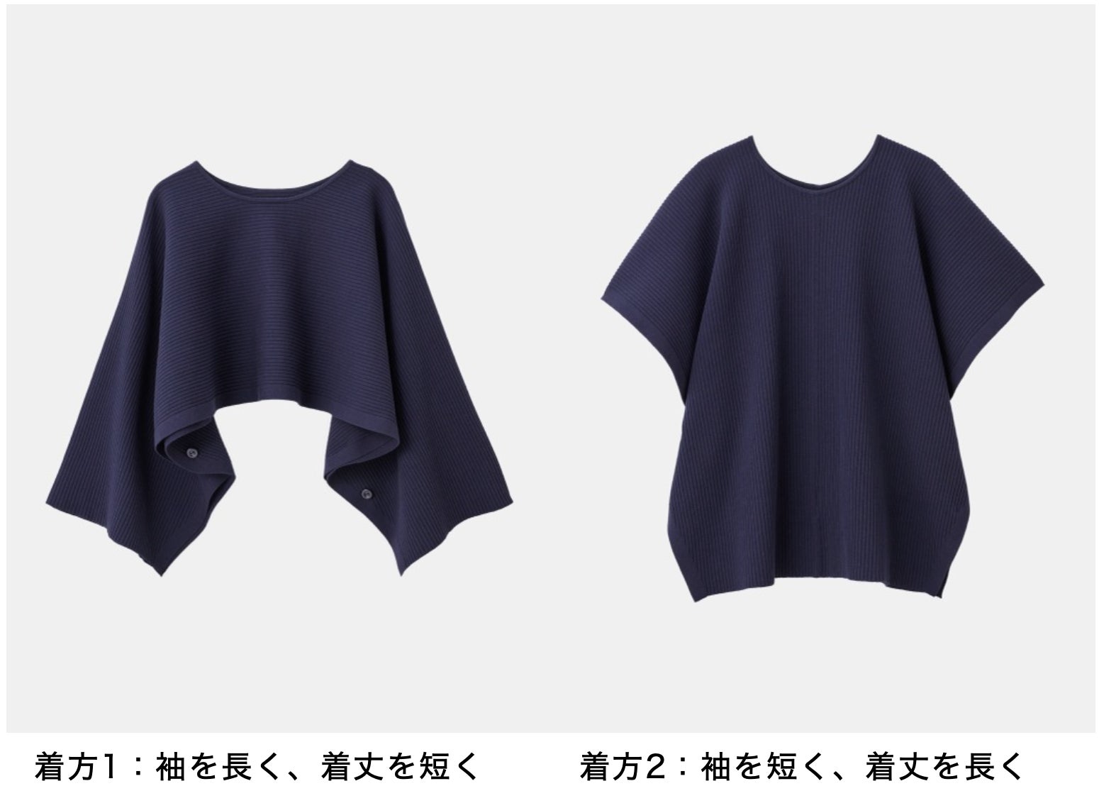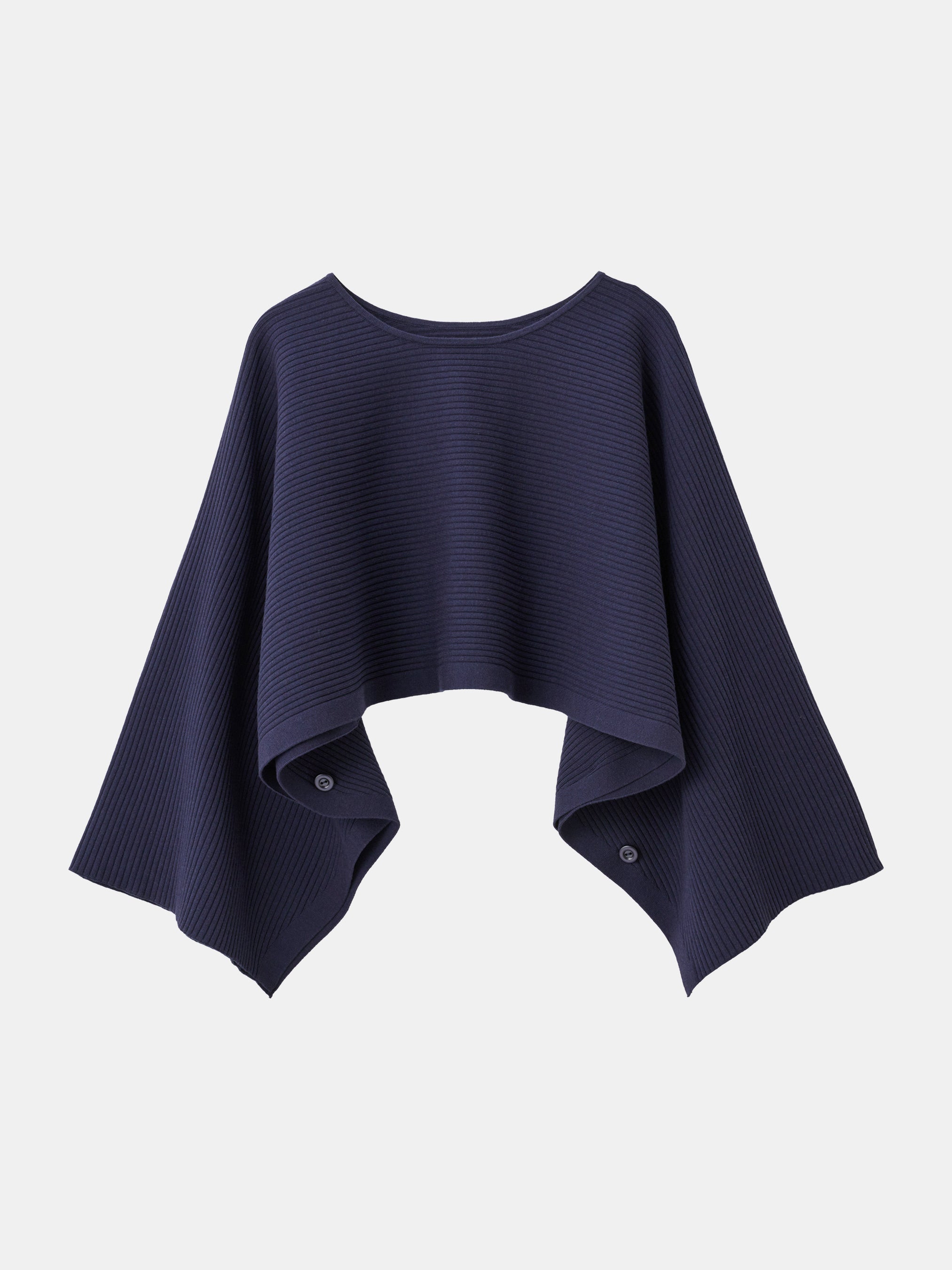 「コットンブレンドニットケープ」は羽織ることで暖かさをプラスするだけでなく、コーディネートのアクセントにもなるアイテムです。袖下のボタンを留める位置を調整できるため、袖を通す位置を変えた2WAYの着こなしを楽しめます。