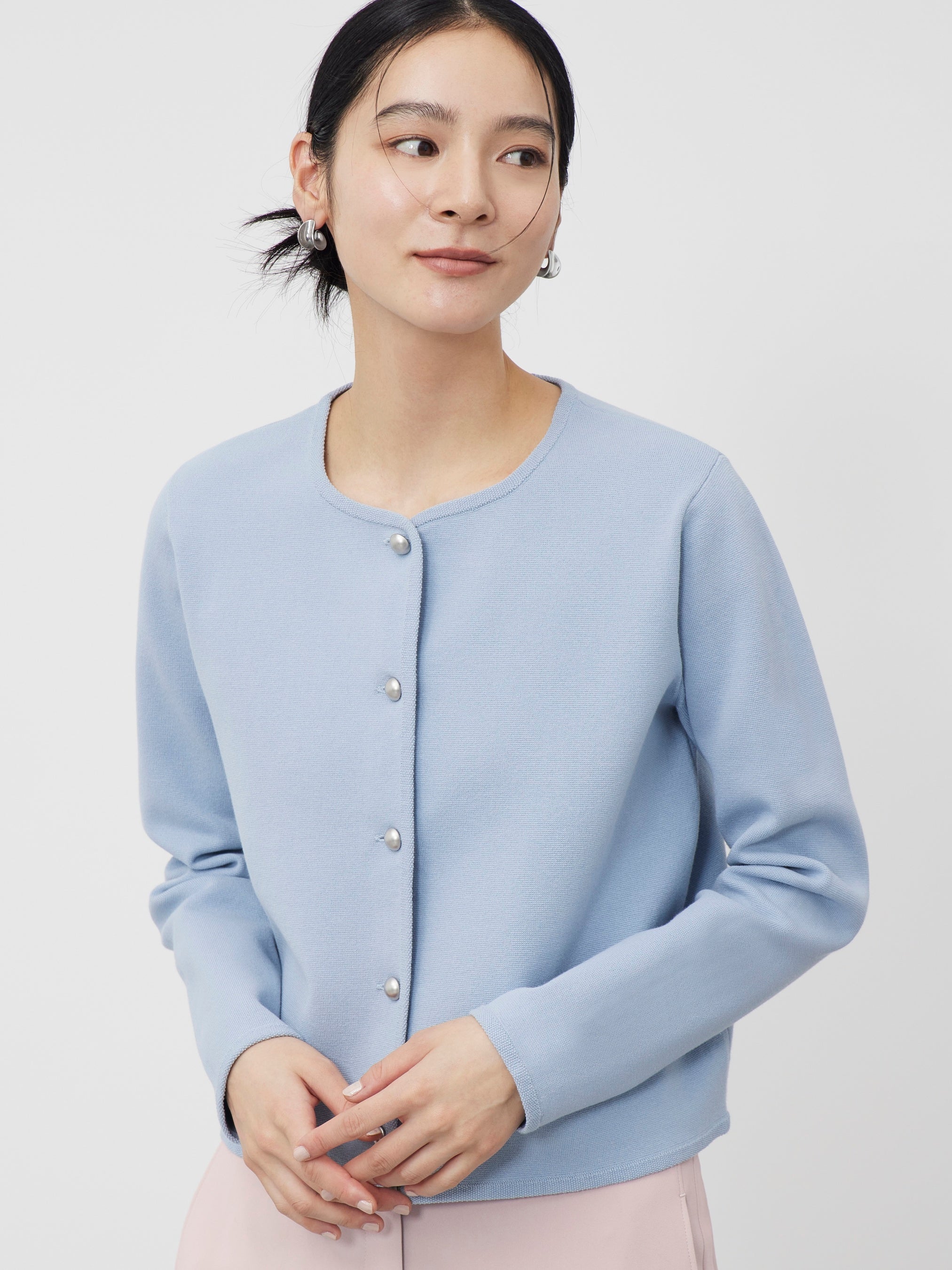 「コットンブレンドカーディガン」は襟からフロントにかけたパイピング状のデザインと、マットな質感のボタンがアクセントになった、ジャケット見えするカーディガンです。ゆったりとした身幅で、ボタンを留めて着用しても体のラインを拾いにくく、プルオーバーとしても着用しやすいシルエットです。