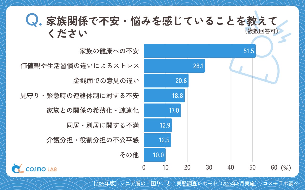 「家族の健康への不安」(51.5%)が最多で、「価値観や生活習慣の違いによるストレス」(28.1%)、「金銭面での意見の違い」(20.6%)が続きます。家族の健康を心配する気持ちが過半数に達している結果は、シニア世代が自分自身の健康だけでなく、配偶者や親、時には子どもの健康状態にも深い関心と不安を抱いていることを示しています。