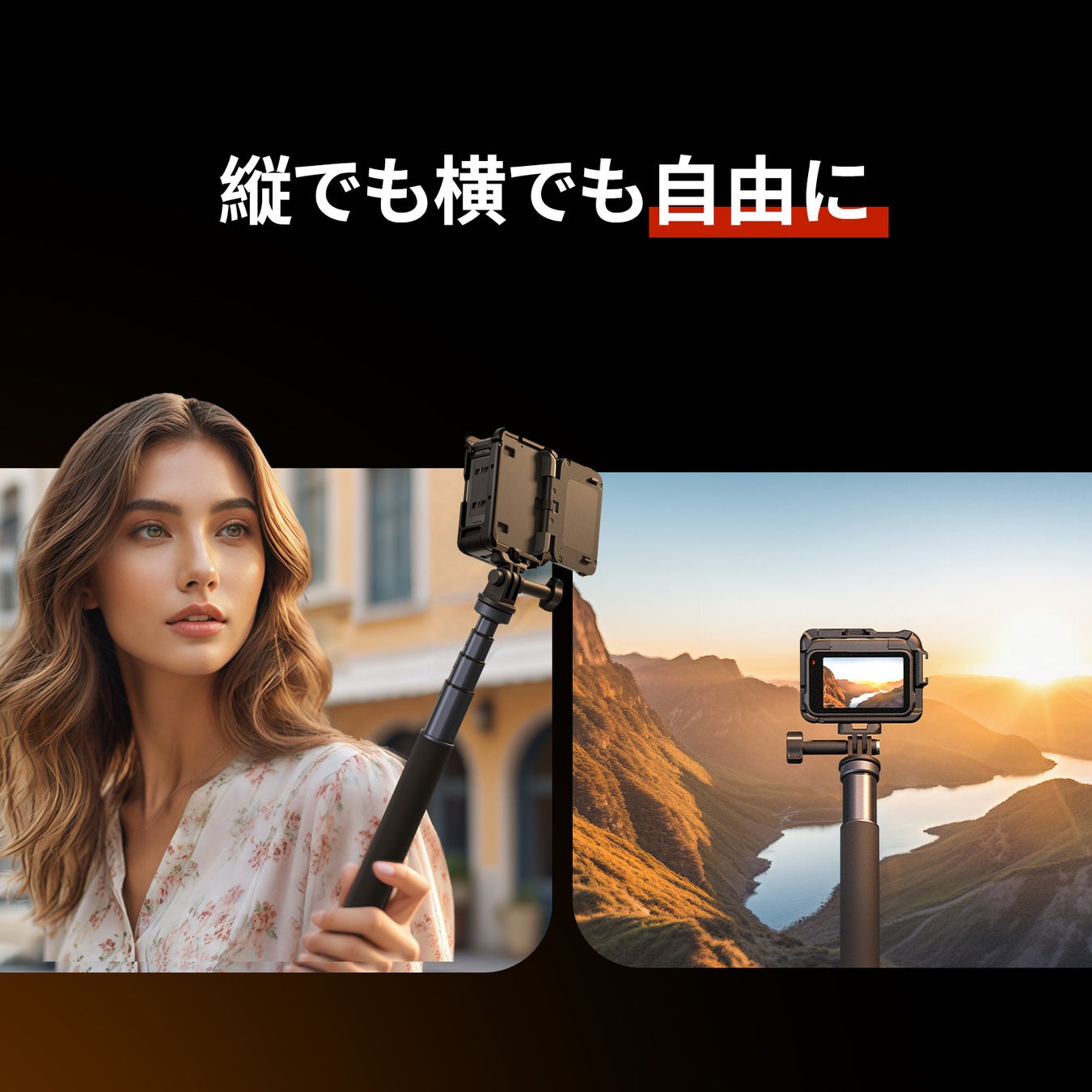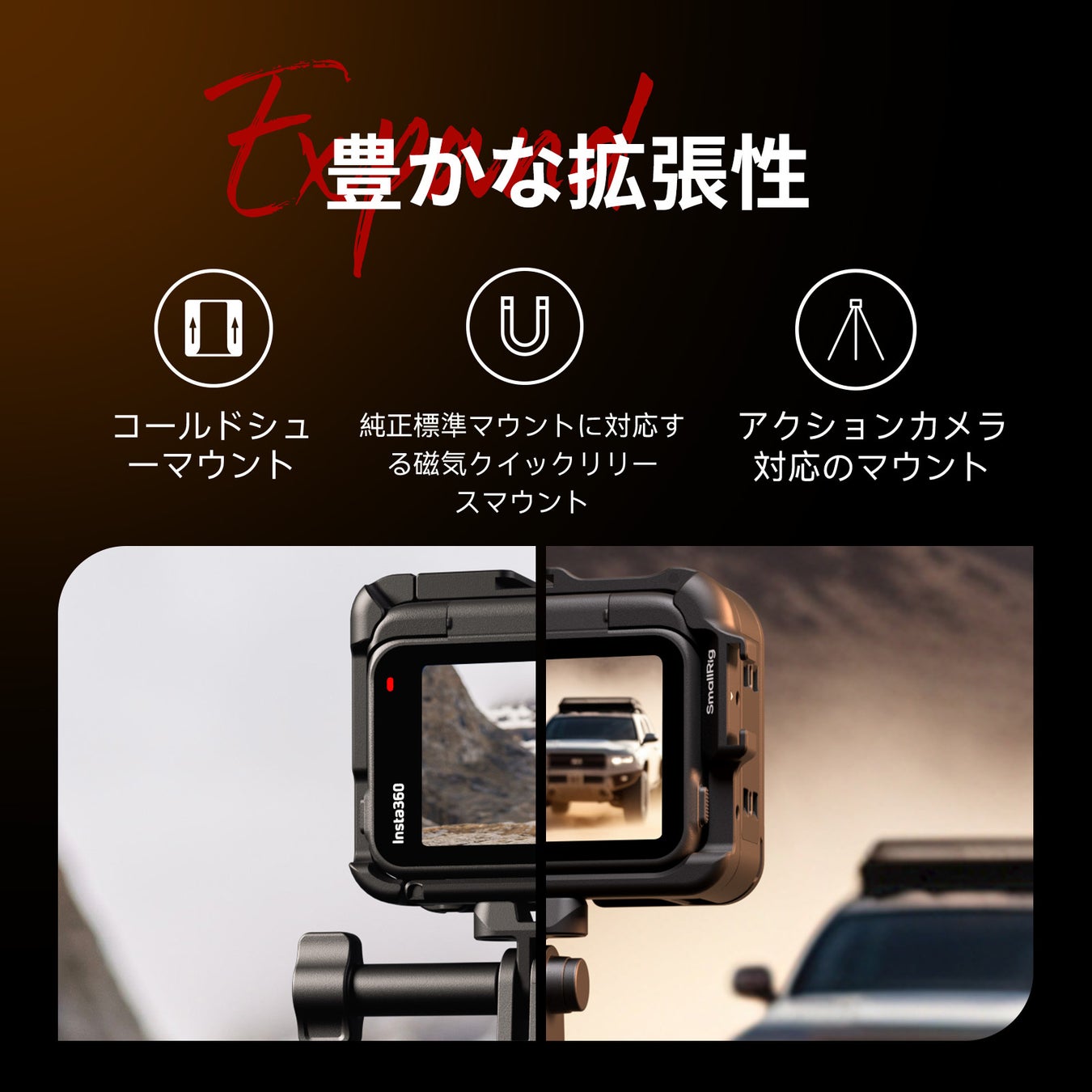 側面と上部にコールドシューマウントを備えたこのケージは、DJI Mic 2 などのさまざまなアクセサリーを取り付けることができ、撮影体験を向上させます。純正のInsta360磁気クイックリリースアダプターと互換性があり、縦撮影と横撮影を自由かつ簡単に切り替えることができます。また、アクションカメラ対応のマウントも搭載しています。
