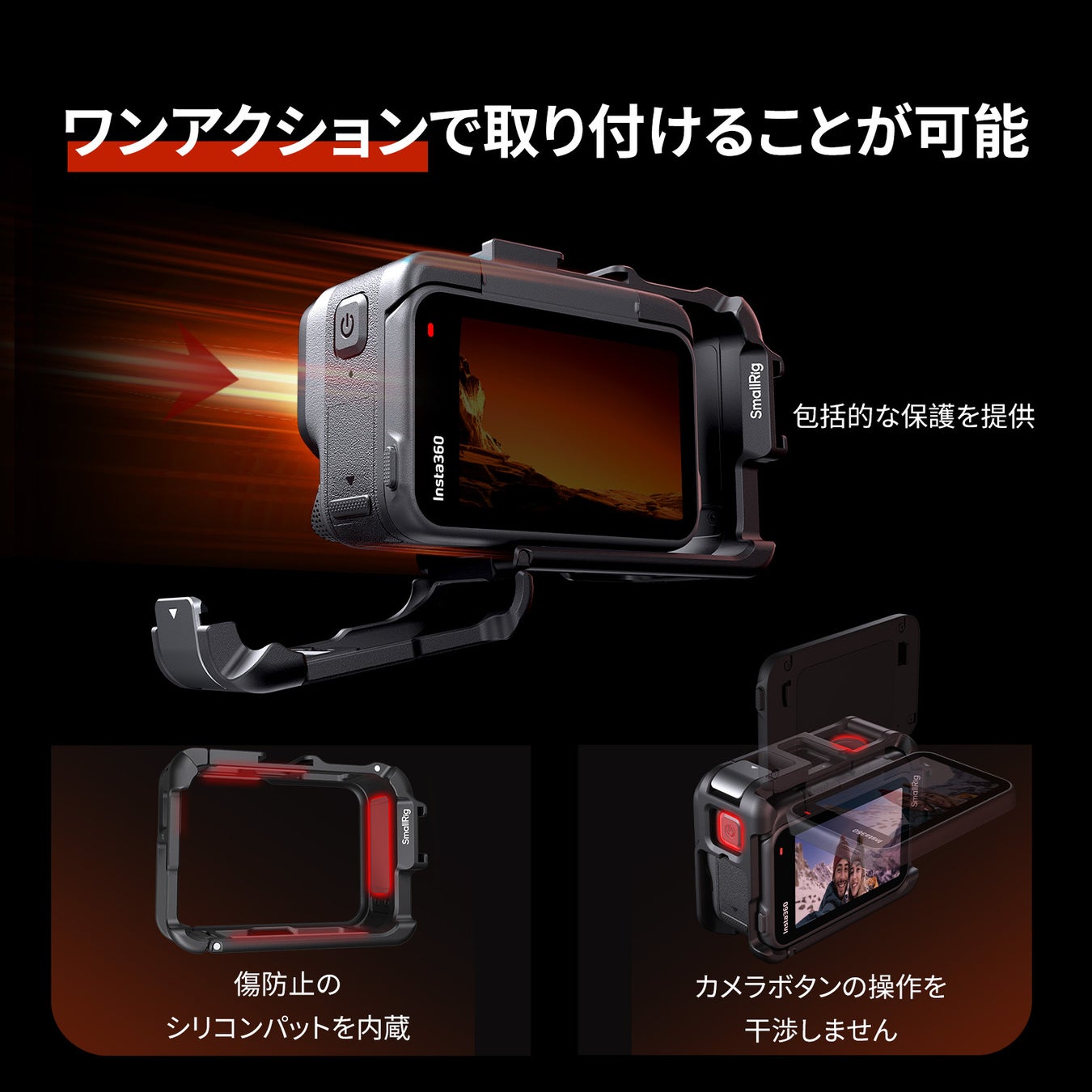 このケージはワンアクションで簡単に取り付けられ、カメラに包括的な保護を提供します。カメラボタンの操作を妨げず、傷防止のシリコンパッドも内蔵しています。