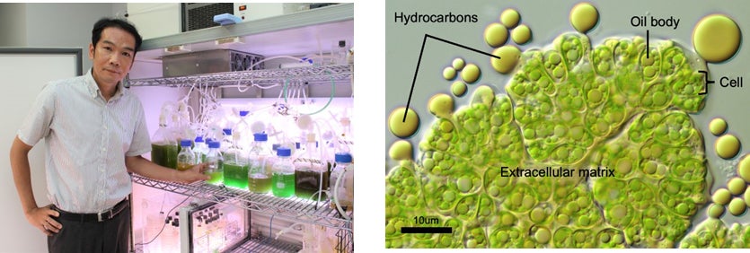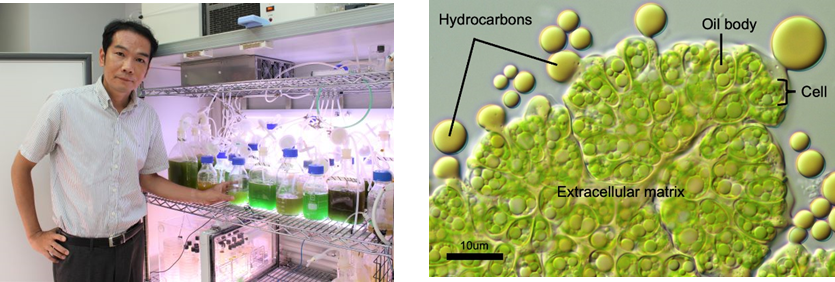 ㊧河村耕史准教授㊨ボツリオコッカスの顕微鏡写真。薄黄色の滴が生成した油