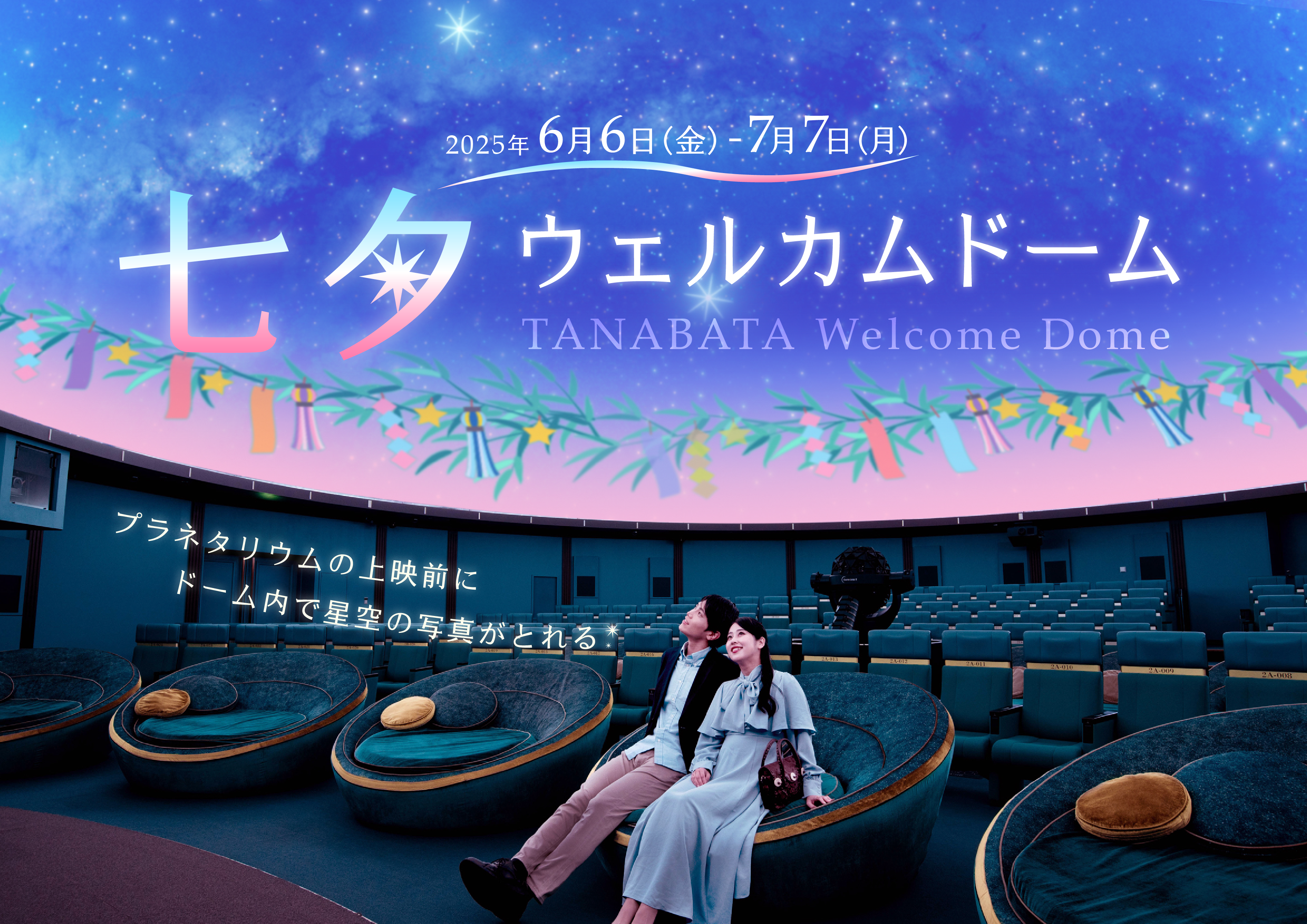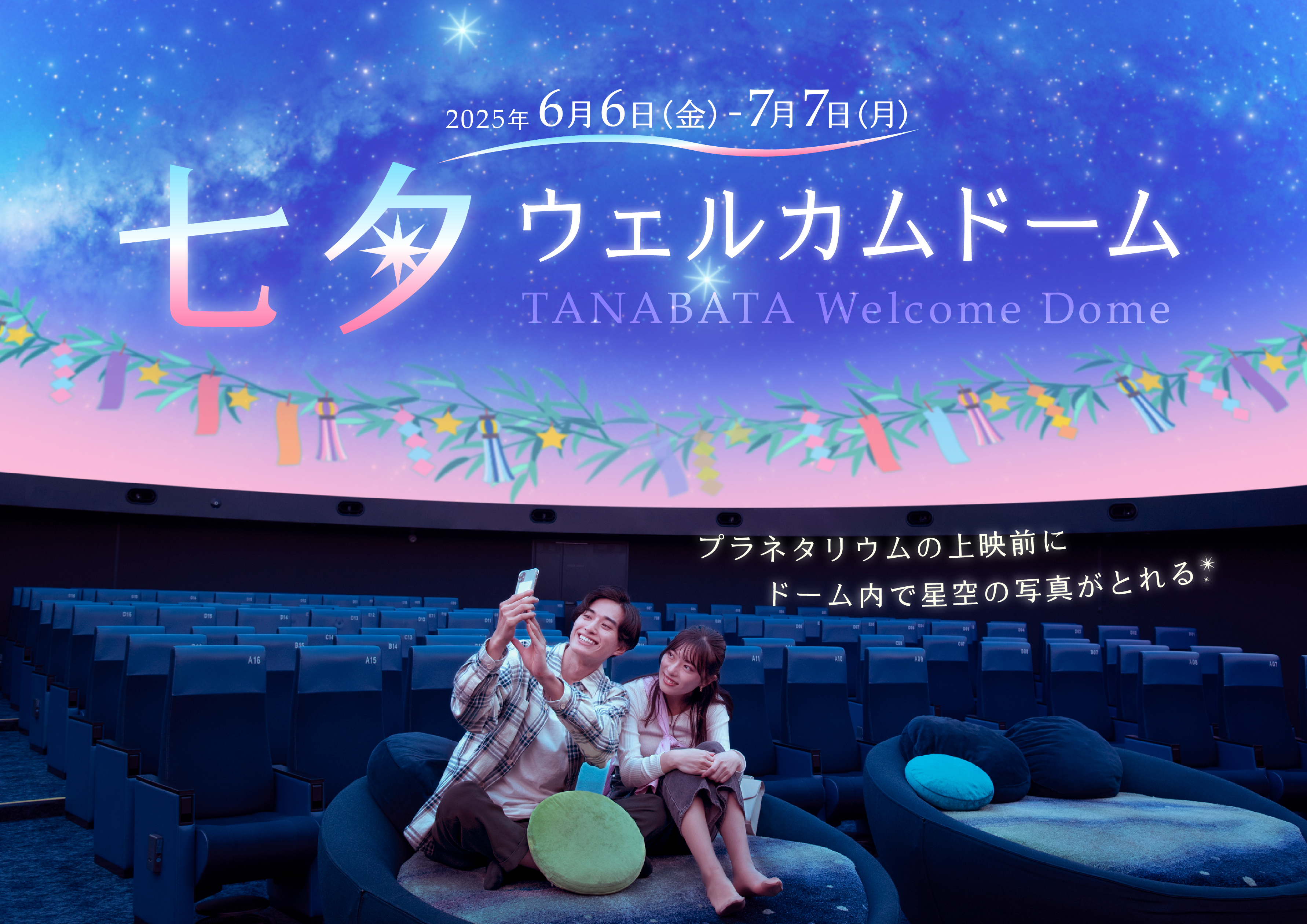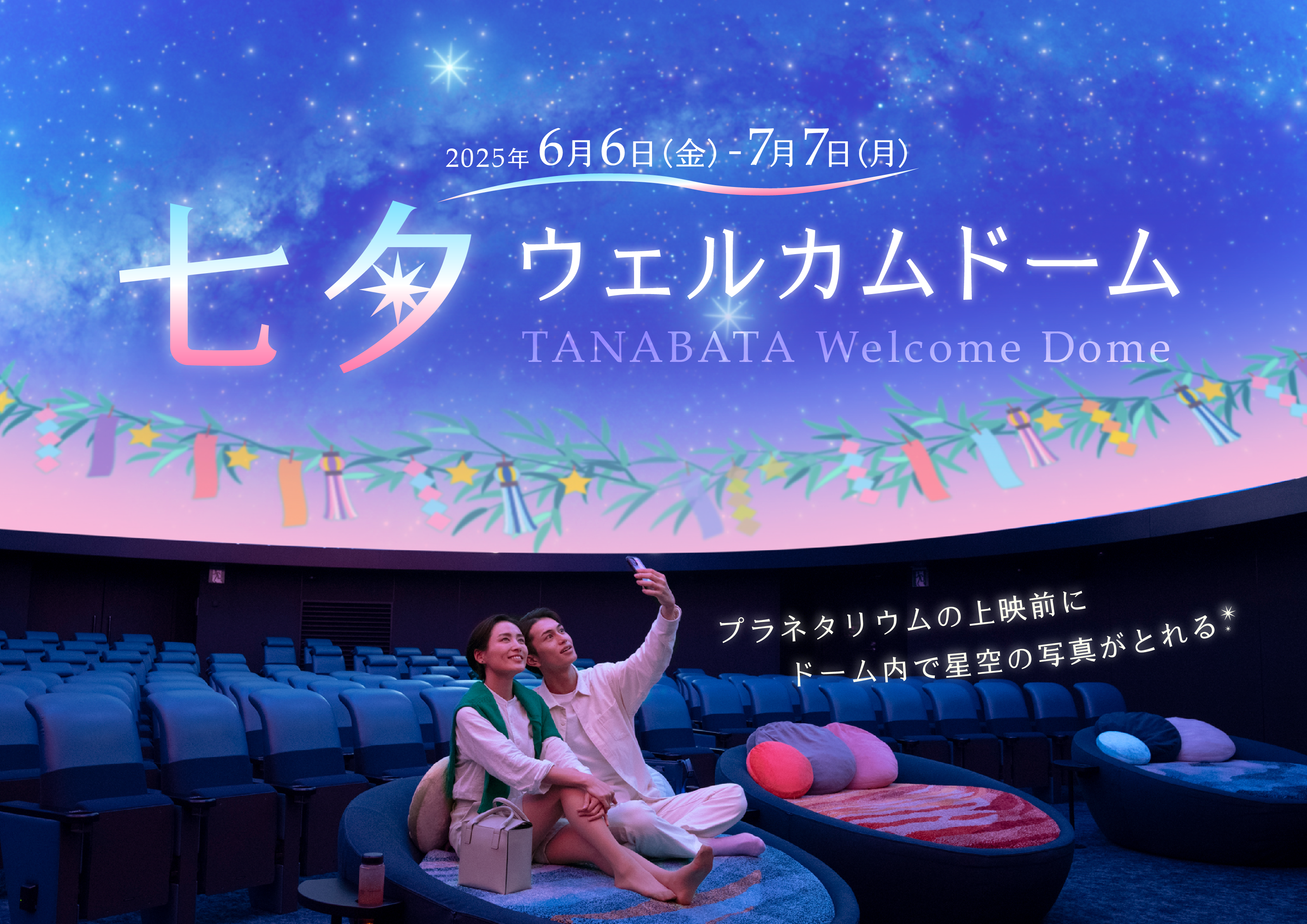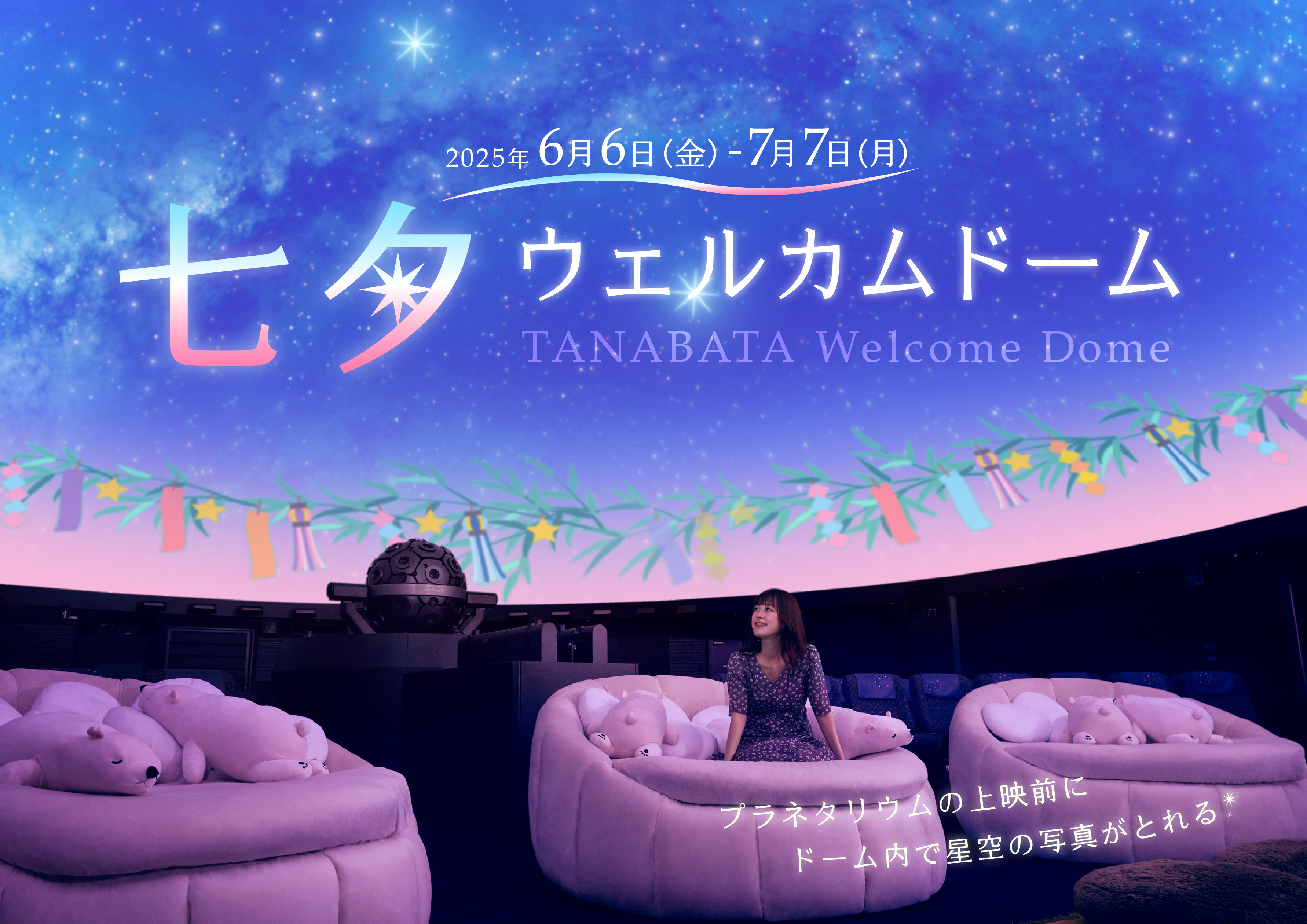 「ウェルカムドーム」とはその名の通り、お客様のドーム入場時に上映している幕間(まくあい)映像のこと。ドーム内に足を踏み入れると、夏の夜空に輝く星座たちや、頭上に流れる天の川、その両岸で瞬く織姫星(ベガ)と彦星(アルタイル)が皆様をお迎えいたします。本編の上映開始までの5~10分間に、涼しく快適な室内で、撮影可能な星空と七夕伝説に思いを馳せるゆったりした時間をお楽しみいただけます。