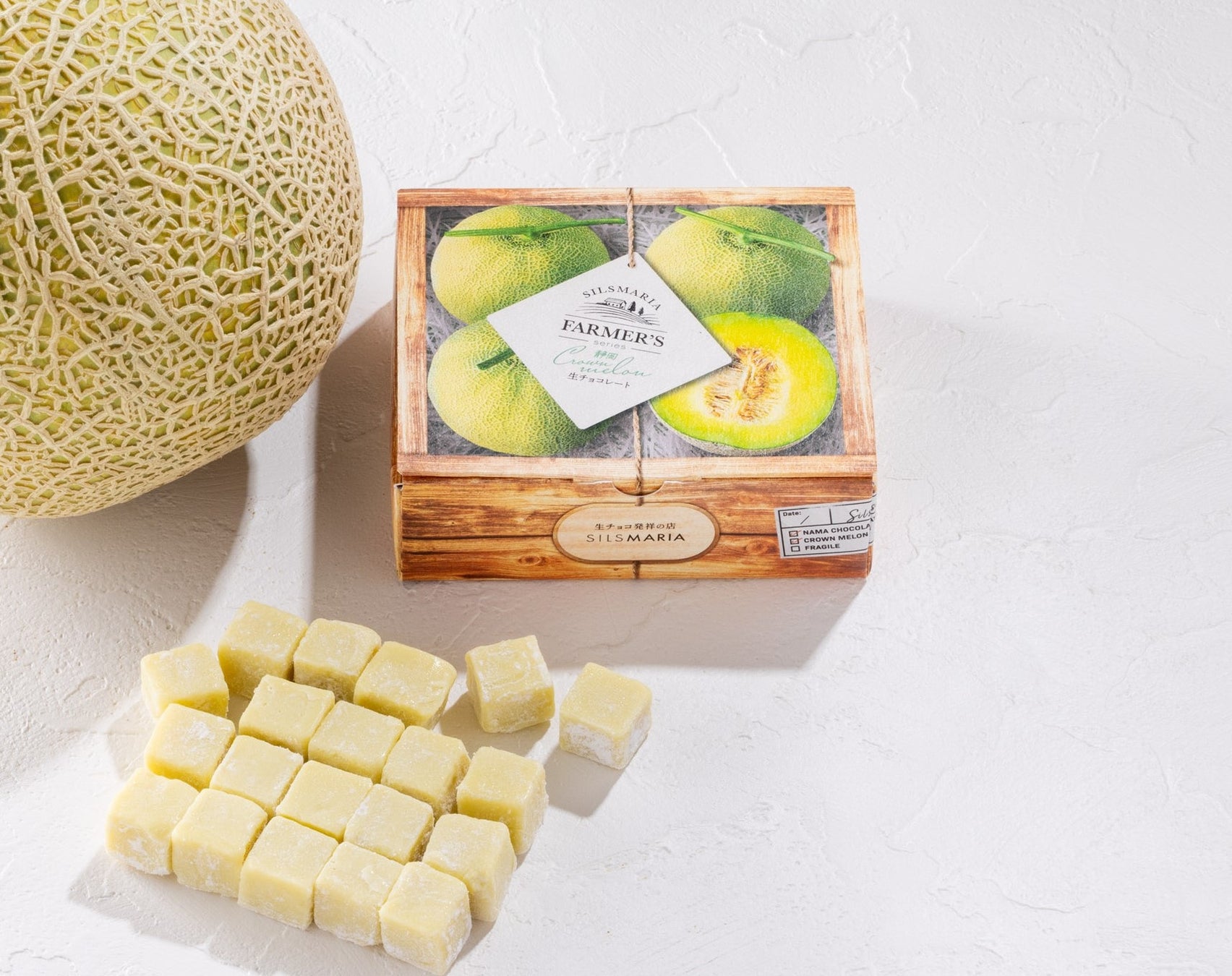 メロンの王様 静岡クラウンメロンと新鮮な北海道産生クリームを使い香り豊かで、ジューシーな生チョコレートに仕上げました。"ホワイトチョコレート"と"クラウンメロン"のマリアージュをお楽しみください。