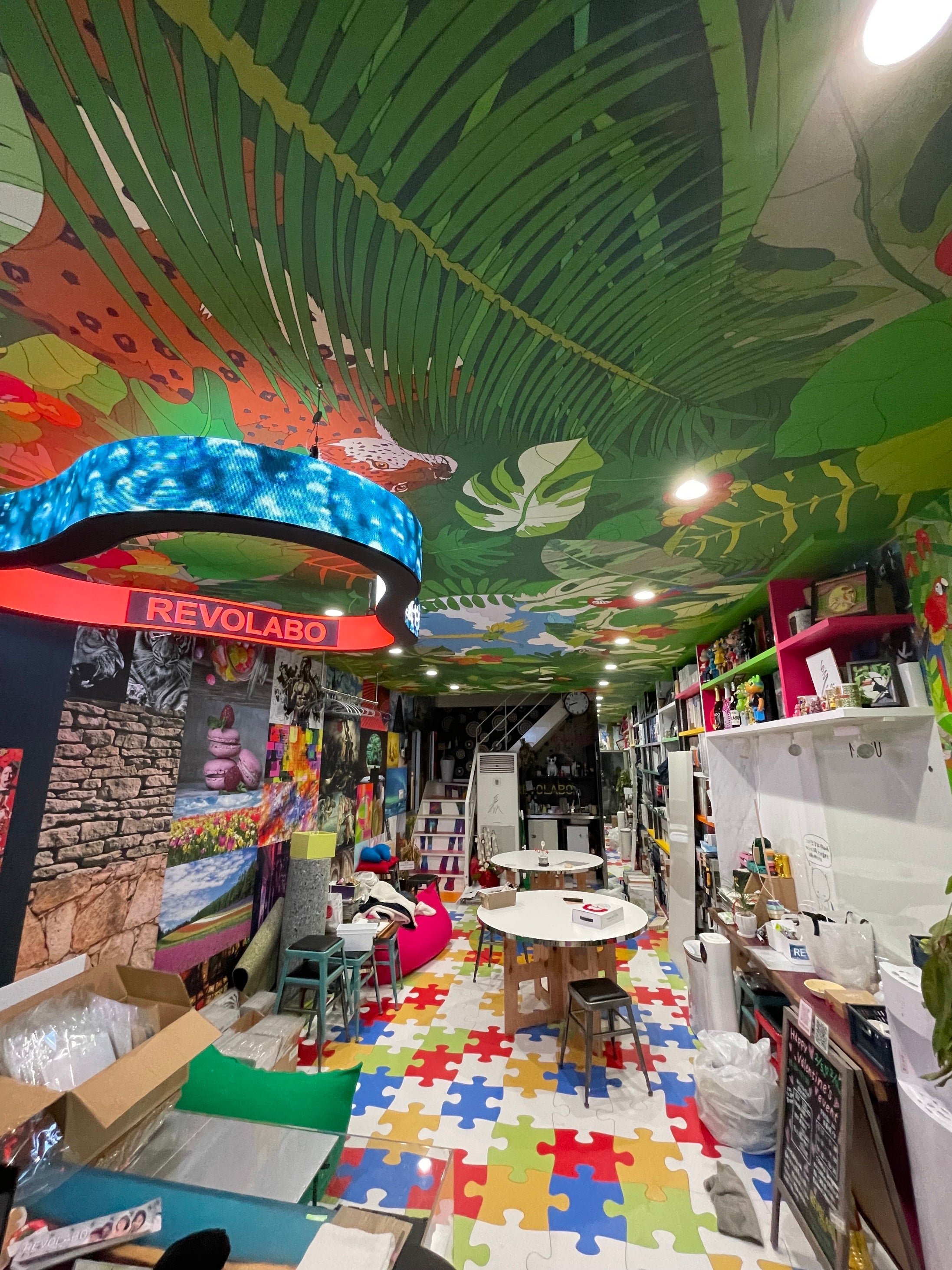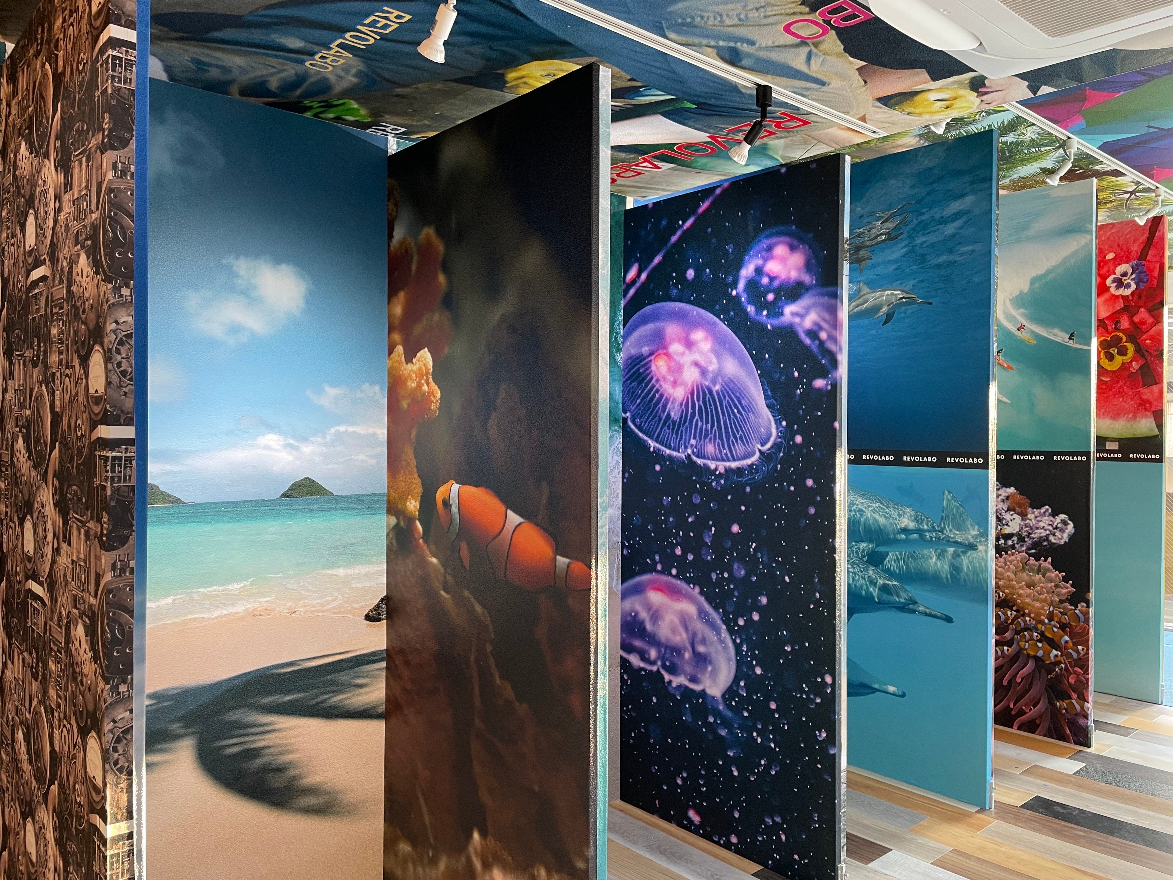 一級技能士による自社施工にこだわりを持ち、壁紙や床材の施工、カーテン・ブラインドの取付け、OAフロアの施工など幅広く行っている株式会社Tdecoration。大阪市内に構えるショールーム兼オリジナル印刷工房の “REVO LABO” では、Tシャツやタオルなどに好きな画像やデザインで1枚からオリジナルプリントができたり、ショップのロゴ入りなどオリジナル壁紙の制作も可能。定期的にワークショップやDIY教室も開催されている。