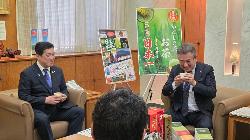 会談では、プロジェクト第1弾となる「ハルカス・ニッポン博覧会 地方創生 発見の旅 鹿児島編」の開催目的や、あべのハルカス近鉄本店の全館を通した多角的な情報発信計画について報告いたしました。知事との歓談では、特産品の「かごしま茶」の試飲や、株式会社島津興業より贈呈いただいた伝統工芸品「薩摩切子」のラペルピンの紹介が行われ、終始和やかな雰囲気の中で、本プロジェクトを通じたさらなる地域活性化への期待が語られました。
