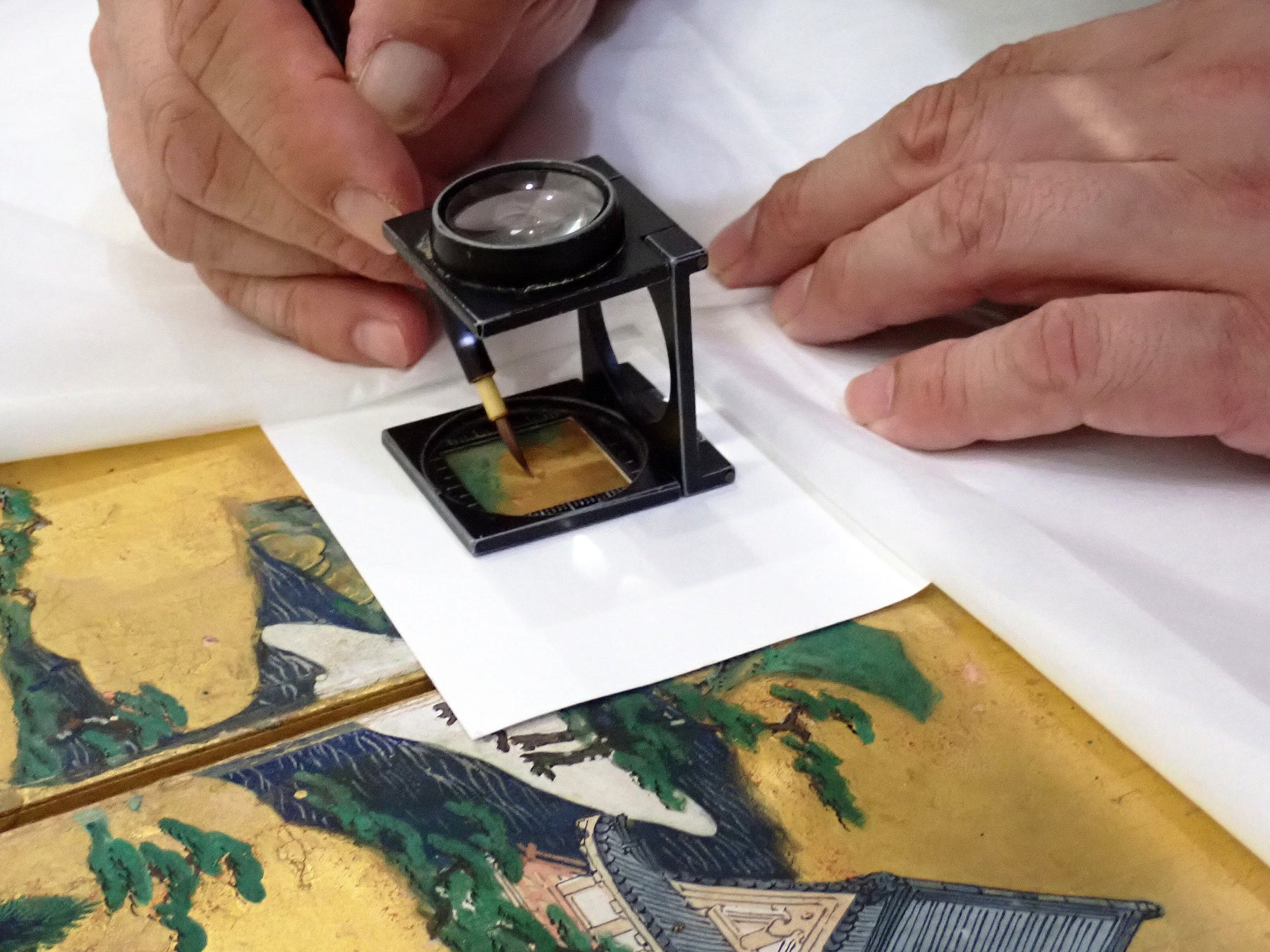 修理は文化財修理技術者の手によって、絵具がはがれている部分には筆を使って膠(にかわ)を入れて乾かし、本紙が浮き上がっている部分には新糊(小麦澱粉糊)を注入して乾かすといった、丁寧で細かな作業が繰り返し行われました。