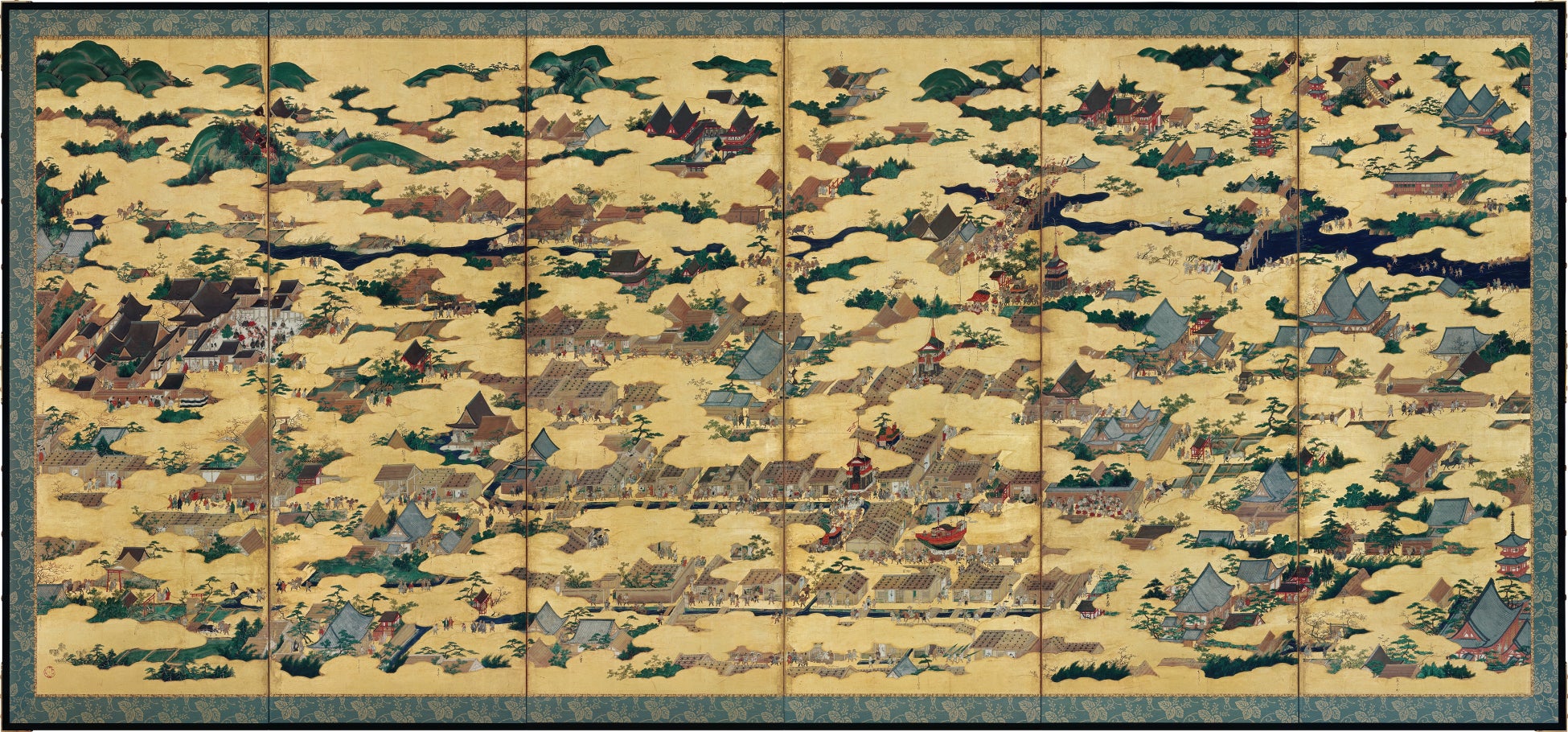 「上杉本 洛中洛外図屏風」は、桃山期を代表する画家である狩野永徳(かのうえいとく)によって描かれたもので、天正2年(1574)、織田信長が友好関係構築のために上杉謙信へ贈ったものと伝わっています。高さはおよそ1m60cm、幅は左右それぞれ約3m70cmで、右隻に東、左隻に西の京都(洛中と洛外)の街並みと四季、そこに暮らす2,500人もの人々の生活風俗が細密描写によって活き活きと表現されています。洛中洛外図屏風は江戸時代に流行し、100点以上が現存していますが、上杉本と呼ばれる上杉家伝来のこの屏風は、その中でも初期のものであり、保存状態も良好です。平成7年には国宝に指定されました。