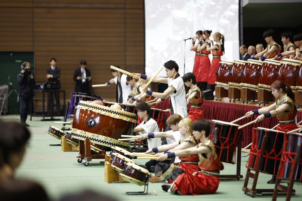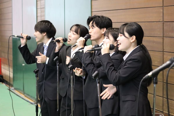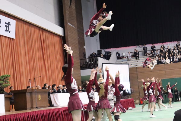 和太鼓部「鼓舞猿」や応援指導部が力強いエールを送り、校歌斉唱の後には色彩テープが宙を舞い、華やかに新入生を迎えました。
