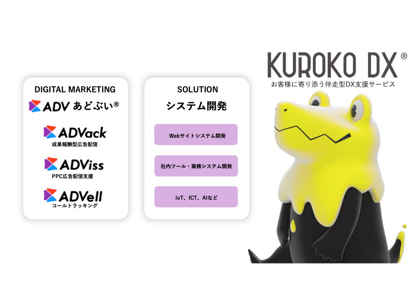 システム開発ソリューションからマーケティングまで、まるで黒衣(くろこ)のように影から寄り添い支える一気通貫のDX支援サービスです。