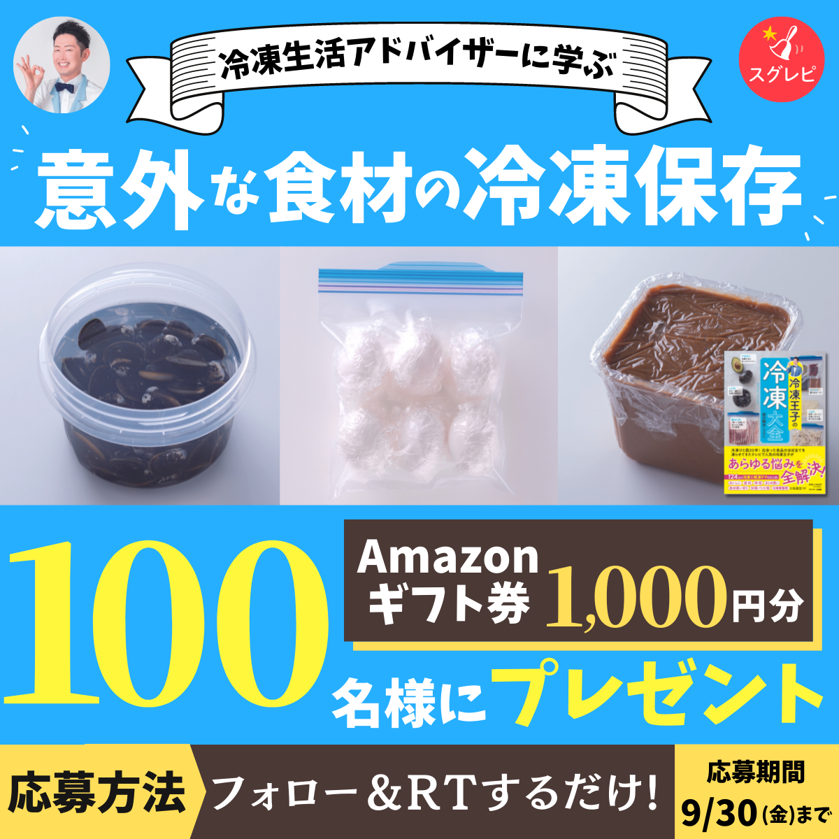 食品を使い切れない時に活用したいのが「冷凍庫」です。冷凍生活アドバイザーの西川剛史さんによる、意外な食材も冷凍ができるそのコツや解凍テクニックを「スグレピ」の公式Twitterで紹介します。ユーザーからは食品ロスを出さないために工夫していることをハシュタグ「#スグレピ食品ロス削減チャレンジ」をつけてツイートを募集。「スグレピ」のツイートをリツイート及び公式Twitterアカウントをフォローすることでプレゼントにも応募が可能です。