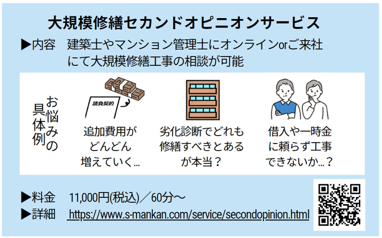 個人向け総合不動産コンサルティング・ホームインスペクション(住宅診断)、マンション管理組合向けコンサルティングを行う“不動産の達人”株式会社さくら事務所(東京都渋谷区/社長:大西倫加)は、大規模修繕工事に向けて、悩み・不安を抱える管理組合に対し、第三者的立ち位置でアドバイスを行う『大規模修繕セカンドオピニオンサービス』を開始しました。本サービス開始を記念し、期間限定サービス無料キャンペーンを先着10組合様へご提供いたします。悩みを抱える組合様は、この機会にぜひサービスサイトよりお申込みください。※詳細の条件は下記をご覧ください