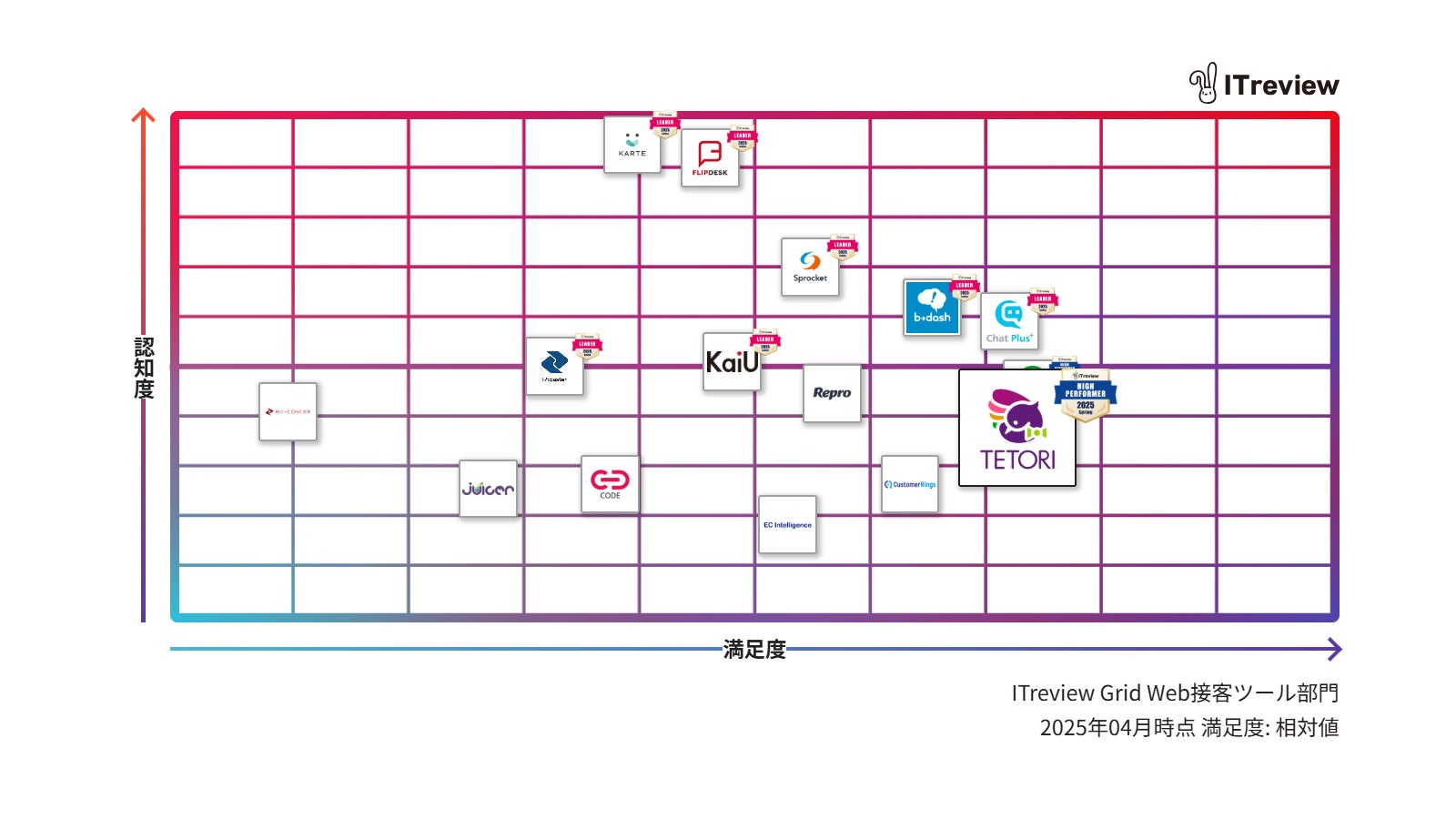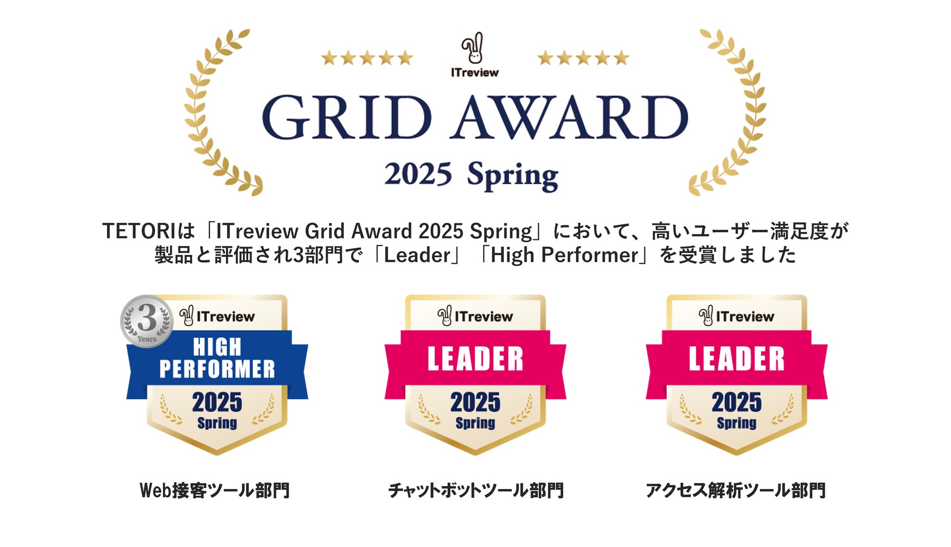 ITreview Grid Awardとは、法人向けのソフトウェア、クラウドサービスのレビュー(口コミ)プラットフォーム「ITreview」に投稿されたレビューをもとに、四半期に一度ユーザーに支持された製品が表彰される場になります。Web接客ツール「TETORI(テトリ)」は、「ITreview Grid Award 2025 Spring」の「Web接客ツール部門」において「High Performer」、「チャットボットツール部門」「アクセス解析ツール部門」の2部門において「Leader」の称号を受賞いたしました。今後もさらにお客様の満足度向上を目指してサービス開発に邁進してまいります。